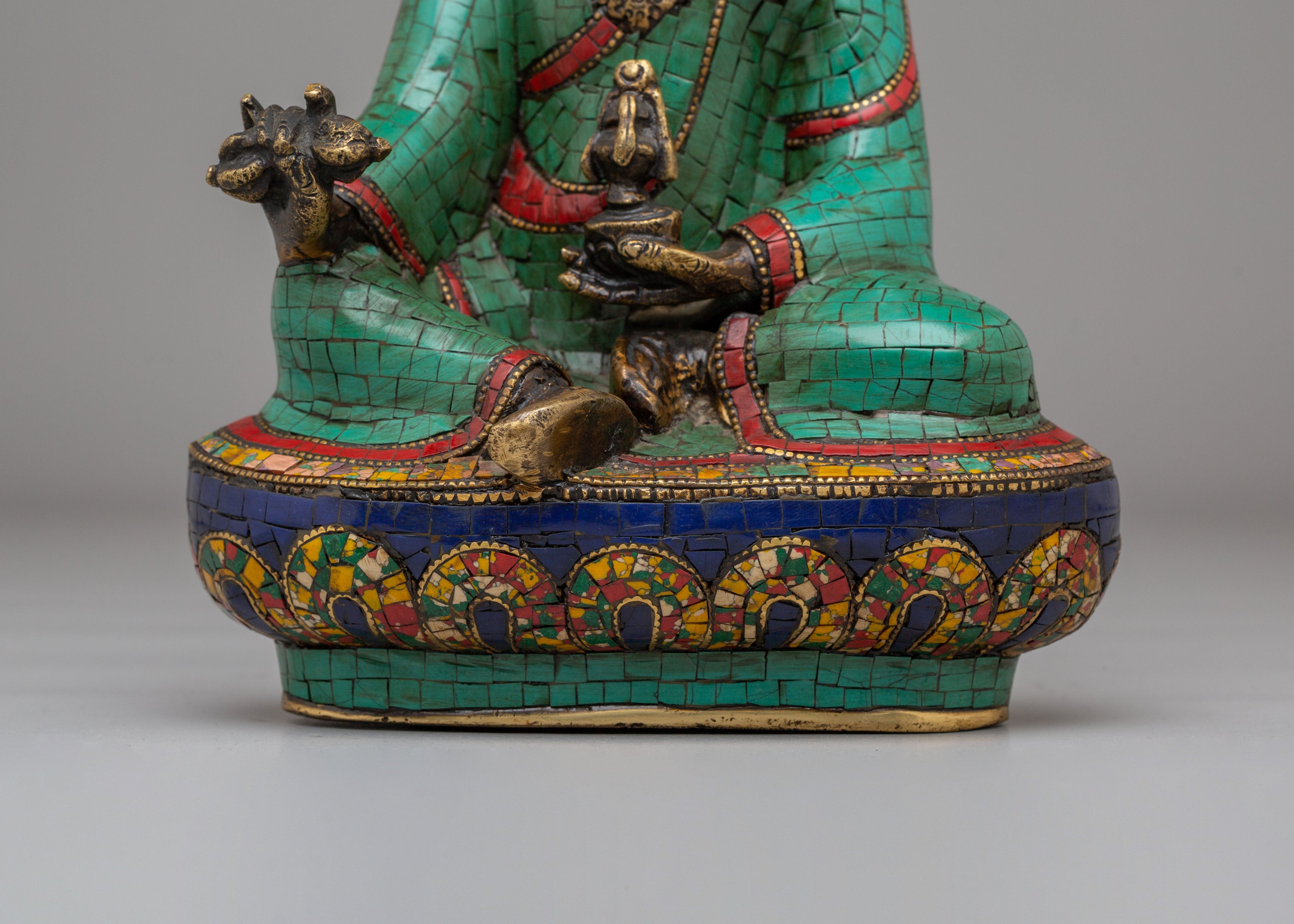The Traditional Guru Rinpoche Statue is a stunning representation of Padmasambhava, known as Guru Rinpoche, the founder of Tibetan Buddhism. Handcrafted with brass and adorned with vibrant coral red stone, lapis lazuli, and turquoise, this statue symbolizes spiritual mastery, wisdom, and protection. Guru Rinpoche is depicted in a seated posture, holding a vajra in one hand and a lotus in the other, embodying the union of wisdom and compassion. The detailed craftsmanship and vivid gemstones make this statue not only a religious icon but also a powerful work of spiritual art.