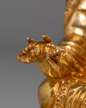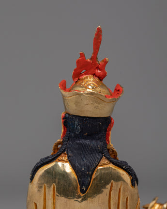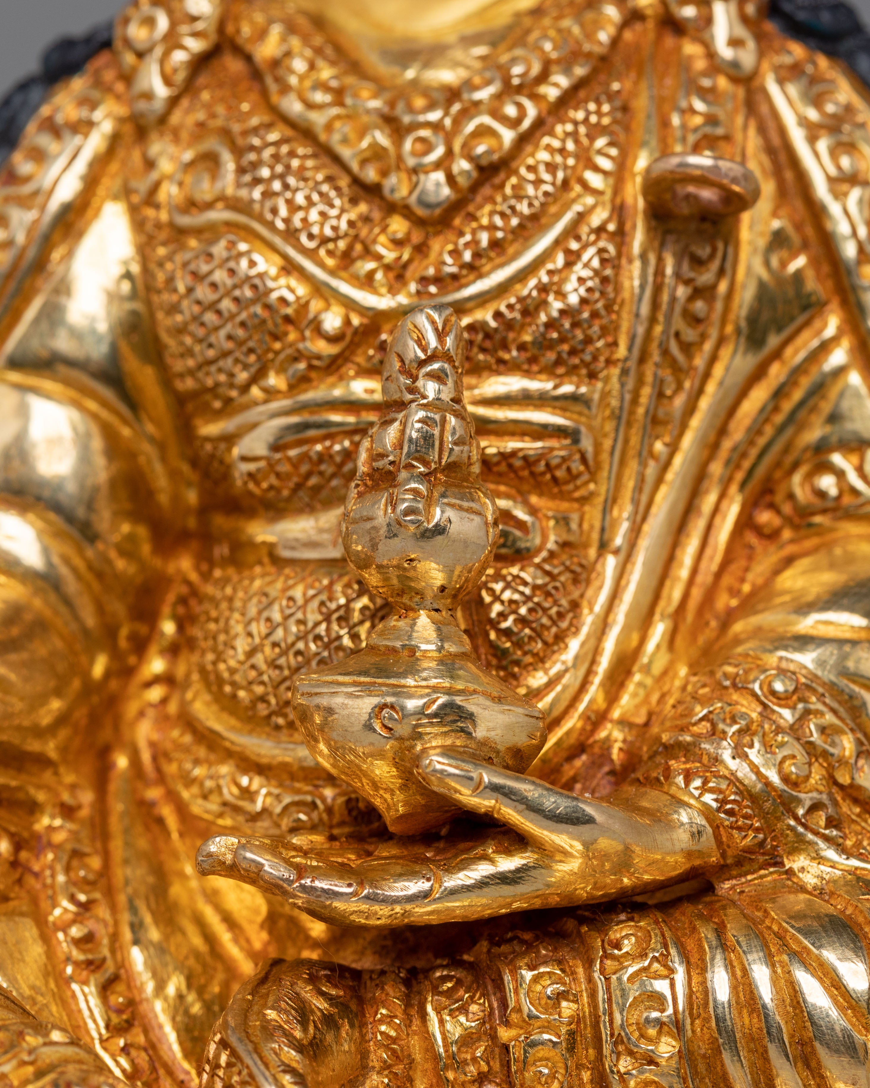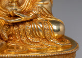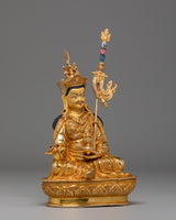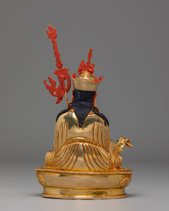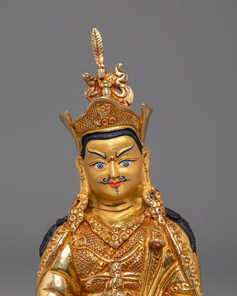 This Vajrayana Master Guru Padmasambhava Statue is a stunning handcrafted representation of Guru Rinpoche, revered as the founder of Vajrayana Buddhism in Tibet. Made from a copper body and finished with luminous 24K gold gilding, this statue features rich acrylic color detailing that enhances the figure's depth and expression. The craftsmanship highlights every symbolic element, making this a powerful spiritual centerpiece for any altar or meditation space.