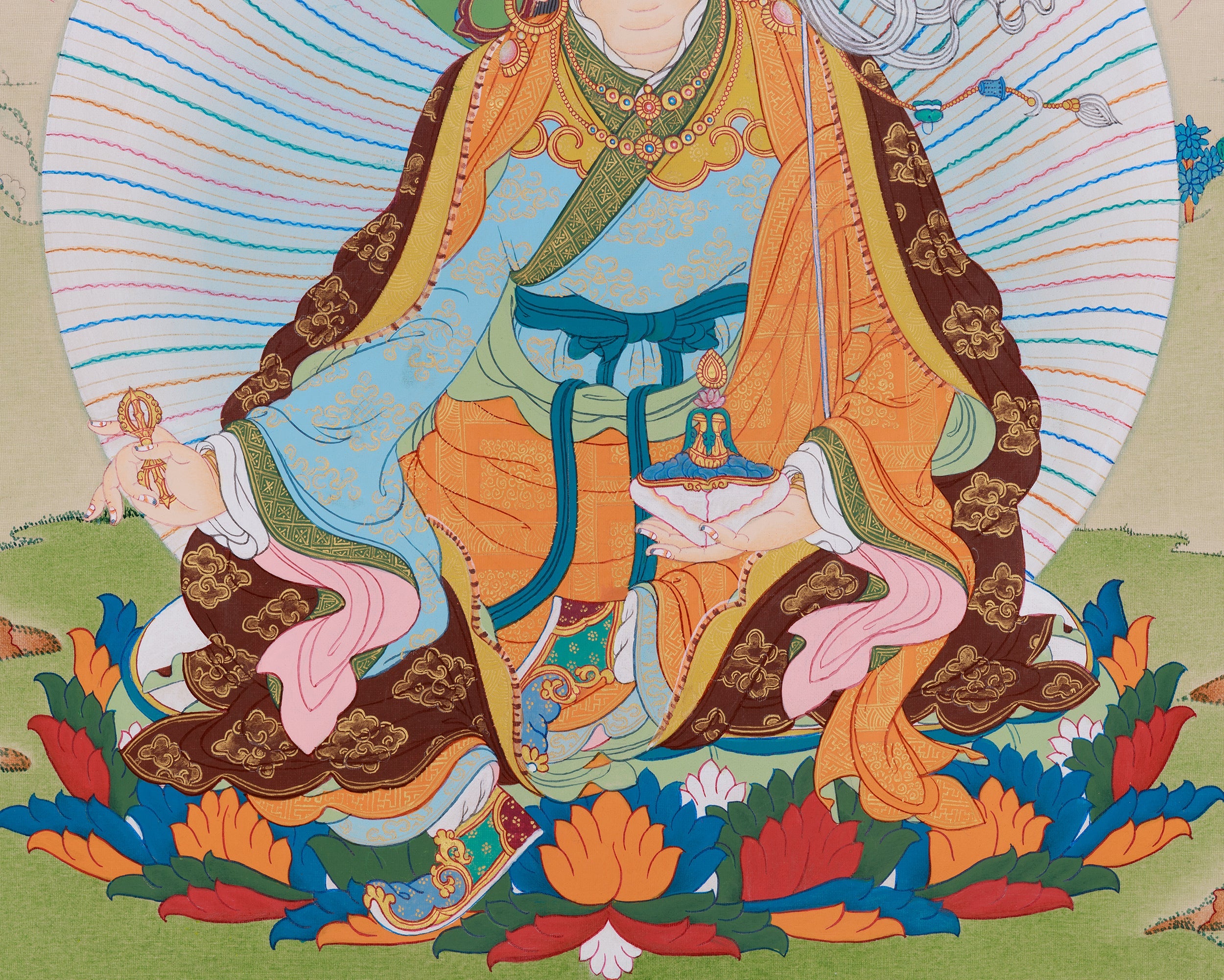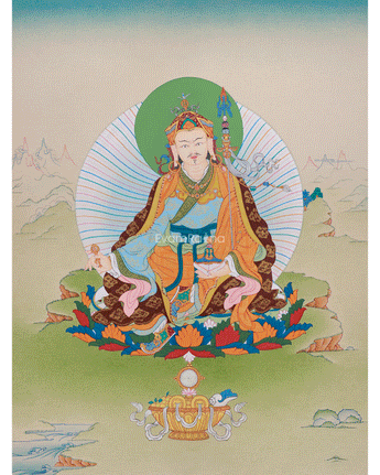 Guru Padmasambhava, also known as Guru Rinpoche, is a legendary figure in Tibetan Buddhism. He founded the Nyingma school and brought Vajrayana Buddhism to Tibet. He is a symbol of protection and enlightenment, representing his spiritual mastery over elements. He is depicted in regal attire, seated on a lotus throne, holding a five-pronged Vajra and skull cup with a vase. His lotus hat, vulture feathers, and half-vajra symbolize mastery and spiritual knowledge. The moon disc and katvanga highlight his transcendental power. Buying a Thangka offers the blessings of Guru Padmasambhava, promoting wisdom, protection, and growth. Its craftsmanship and symbolism make it a cherished artifact for meditation, worship, or collection.