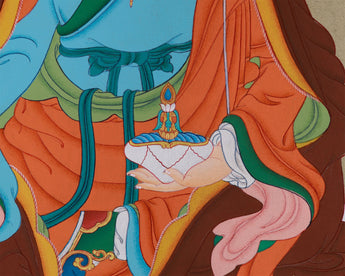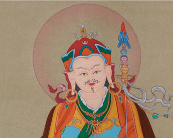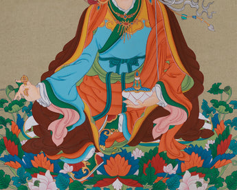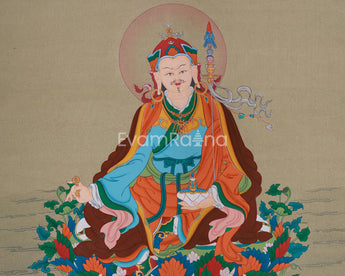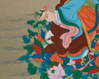 The Precious Master, Guru Rinpoche, is revered as the second Buddha and the founder of Vajrayana Buddhism in Tibet. Known for his profound wisdom and transformative powers, he embodies compassion, courage, and spiritual insight. The thangka is hand-painted on fine cotton canvas using vibrant acrylic colors and detailed with genuine gold, enhancing the vibrancy and depth of the figure. The gold detailing highlights sacred symbols and ornaments, giving the artwork a radiant appearance. Created in the traditional Karma Gadri style, the painting features spacious composition and flowing landscapes, emphasizing clarity and harmony.
