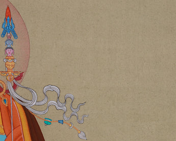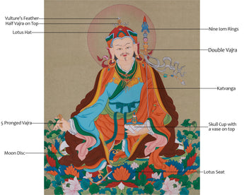 The balanced composition places Guru Rinpoche on a lotus seat, symbolizing purity and enlightenment. The vulture's feather and half-vajra atop his hat symbolize transcendent wisdom. In his right hand, he is holding a five-pronged vajra that represents indestructible truth, and the skull cup with a vase in his left hand signifies the transformation of ignorance into wisdom. The katvanga resting on his shoulder is an emblem of his mastery over samsara.