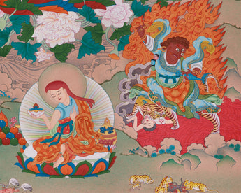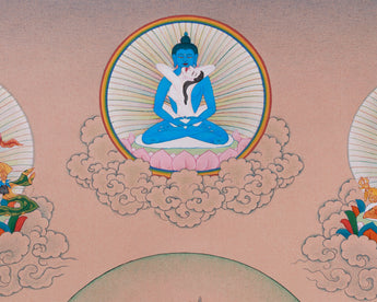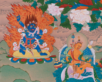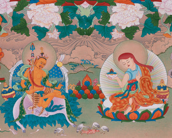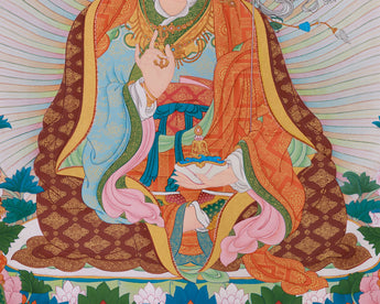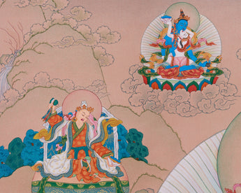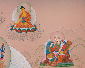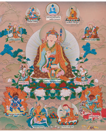 Guru Padmasambhava, also known as Guru Rinpoche, is a revered figure in Tibetan Buddhism known as the "Second Buddha." He brought Vajrayana Buddhism from India to Tibet in the 8th century and subdued hostile forces that hindered its spread. Guru Rinpoche was a realized master, tantric yogi, mystic, and teacher whose teachings are preserved in the Nyingma tradition. Seated at the center of the thangka in royal robes and holding a vajra and skull cup, he is surrounded by rich floral motifs and a radiant halo, symbolizing his enlightened qualities. His consorts, Mandarava and Yeshe Tsogyal, played crucial roles in receiving, preserving, and transmitting his teachings. At the top of the composition, Samantabhadra with his consort represents the ultimate nature of the mind, pure awareness that transcends duality.
