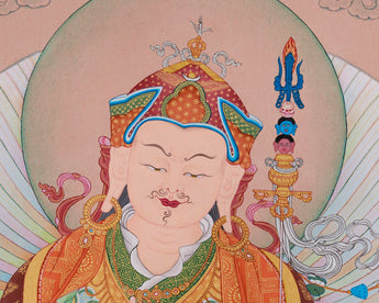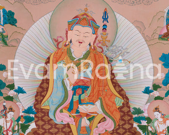 This sacred thangka beautifully depicts eight manifestations of Guru Padmasambhava, each representing a unique aspect of Guru Rinpoche’s enlightened activity. It is hand-painted by skilled artists in our Enlightenment Studio, using a fine cotton canvas. It showcases acrylic colors that are meticulously applied and skillfully layered to achieve the depth, luminosity, and expressive detail of each figure. Genuine 24K gold is intricately used to highlight sacred ornaments, hats or crowns, halos, and symbolic features, enhancing the deities' spiritual presence and divine radiance. The composition follows the traditional Karma Gadri style, known for its elegant spacing, natural landscapes, and soft color palette, which allows each figure to stand out clearly without overcrowding the scene. The serene backdrop of mountains and floral motifs creates a balanced spiritual mandala, radiating artistic excellence and profound symbolic meaning.