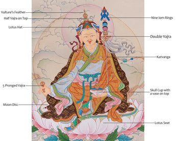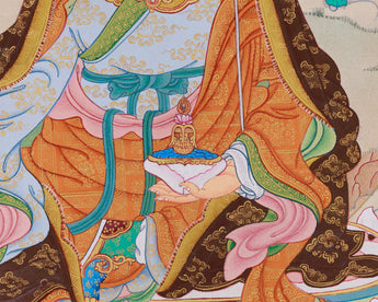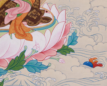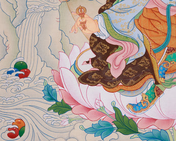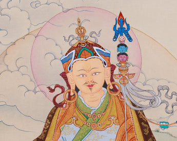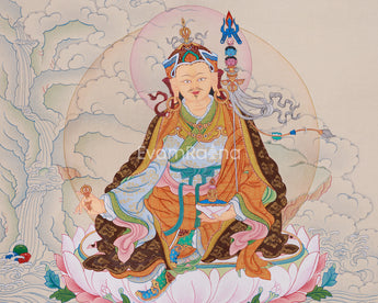 Explore Tibetan Buddhism with this beautiful Padmasambhava Lotus Born Master Thangka, a stunning sacred art piece that vividly portrays the revered Guru Rinpoche. Created from the finest natural stone colors and genuine 24K gold, this hand-painted masterpiece beautifully combines artistic brilliance with spiritual significance. Painted on durable cotton canvas in the esteemed Karma Gadri style, known for its detailed workmanship and peaceful compositions, this thangka invites you to connect with its serene beauty. The vibrant colors and shimmering gold accents highlight Padmasambhava's importance, making this artwork a symbol of enlightenment and wisdom.
