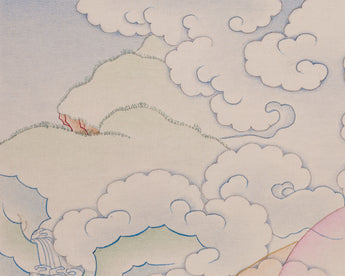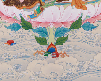 Guru Rinpoche, also known as Padmasambhava, holds a unique and unparalleled place in Tibetan Buddhism for his transformative role in introducing Vajrayana teachings to Tibet. Revered as the Lotus-Born Master, he is said to have miraculously emerged from a lotus flower, symbolizing purity, enlightenment, and divine wisdom. In this thangka, he is portrayed in a dynamic yet tranquil posture, embodying his power and compassion. His right hand holds a five-pronged vajra, symbolizing his control over nature's forces and his ability to eliminate ignorance. In his left hand, Padmasambhava holds a skull cup with a vase atop, representing the transmutation of worldly attachments into sacred offerings and the alchemical process of spiritual transformation.