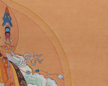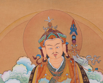 This beautiful thangka of Tantric Guru Padmasambhava has been carefully hand-painted using acrylic colors with genuine 24K gold. Gold is thoughtfully applied to highlight elements like the halo and the detailed attire, adding a radiant touch. Bright acrylic colors infuse life into surrounding elements such as lotus flowers and clouds. Created in the traditional Karma Gadri style, known for its clarity, precision, and lively colors, this piece beautifully blends classical Tibetan techniques with a modern elegance. The mix of old and new energies in this thangka helps capture the guru's transcendental wisdom and celestial authority, making it truly special.
