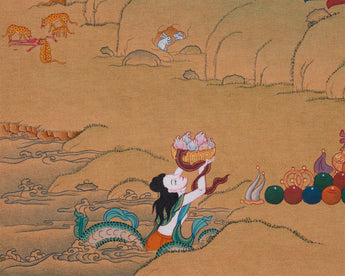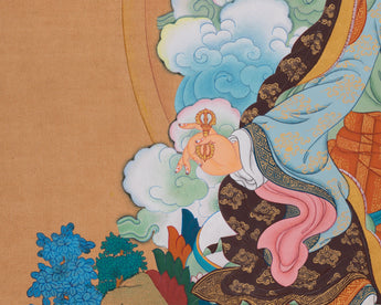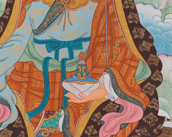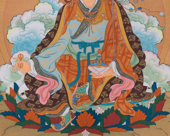 Padmasambhava, a central figure in Tibetan Buddhism, is celebrated for bringing Tantric practices and Vajrayana Buddhism to Tibet in the 8th century, profoundly influencing the region's spiritual landscape. In this thangka, he is depicted seated in a meditative posture that embodies serenity and deep insight. Surrounded by ethereal clouds, his divine aura highlights his ability to transcend earthly realms. Symbolic objects, such as the vajra or skull cup in his hands, emphasize his mastery over both material and spiritual spheres. His attire, decorated with detailed gold accents, symbolizes regal and spiritual authority, while the lotus at his feet represents purity and enlightenment. The lower part of the painting, filled with imagery of animals and offerings, reflects his harmonious relationship with nature and his role as a spiritual guide. This thangka visualizes Padmasambhava’s legacy and encourages reflection on the profound meanings of his teachings.