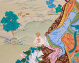 Discover this beautiful Tibetan Guru Rinpoche artwork, expertly hand-painted on delicate cotton canvas using natural stone colors and accented with authentic 24K gold. Created in the timeless Karma Gadri style, this thangka exudes clarity, a spacious composition, and exquisite detail. The natural pigments add depth and brightness, while the gold accents highlight Guru Rinpoche’s enlightened presence. It's a truly sacred painting, perfect for meditation, devotion, or simply as a treasured collector’s item.
