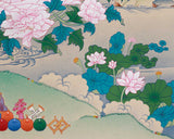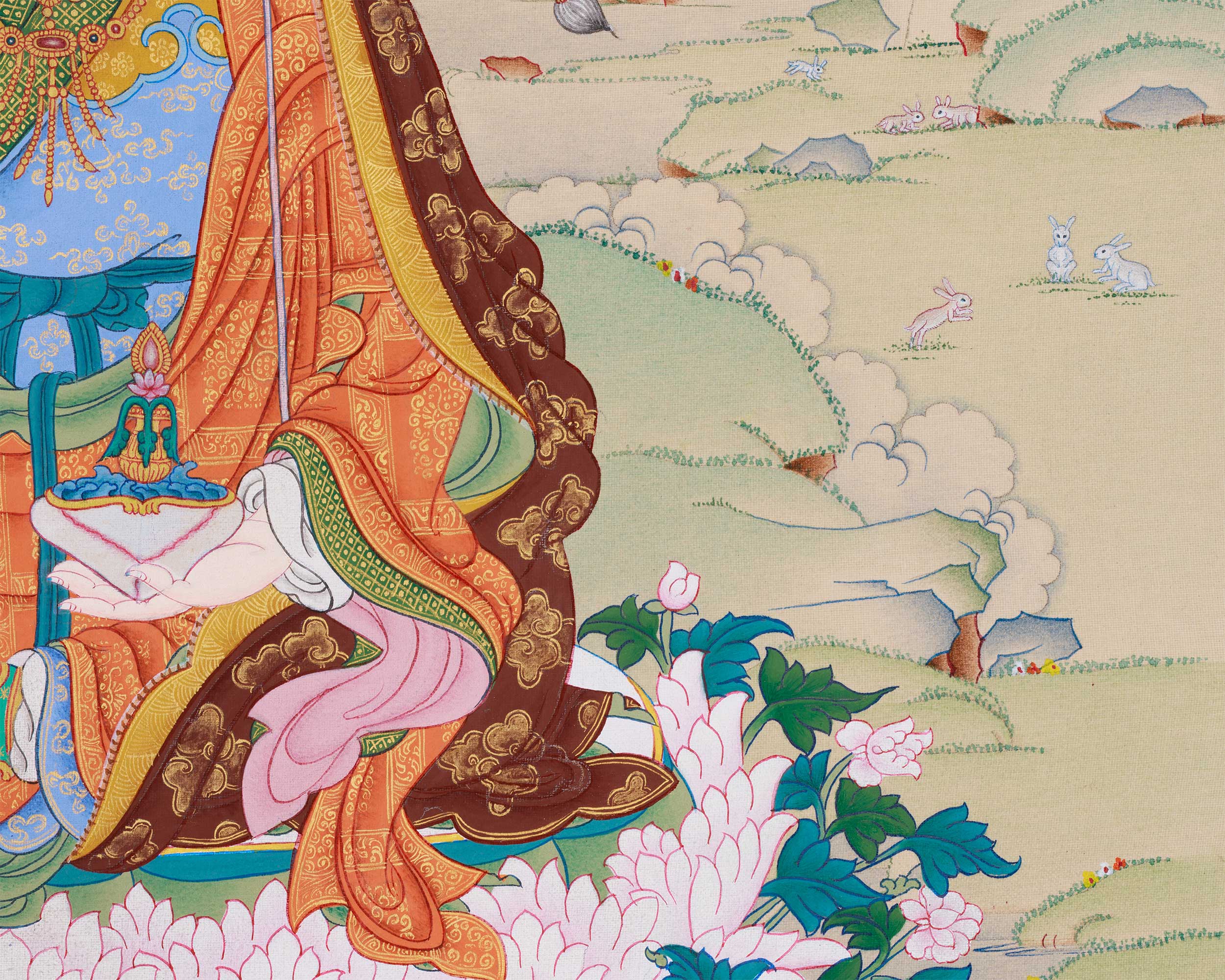 Padmasambhava, also known as Guru Rinpoche, is widely revered as the “Precious Master” who introduced Vajrayana Buddhism to Tibet in the 8th century. In this thangka, he is portrayed seated on a blooming lotus, which symbolizes his miraculous birth from a lotus in Lake Dhanakosha. His right hand holds the vajra, representing unbreakable wisdom, while his left hand cradles a skull cup containing the nectar of immortality. Against his shoulder rests the khatvanga staff, symbolizing his tantric realization and union of wisdom and compassion. His expression exudes compassion and power, embodying his role as a spiritual protector and teacher.