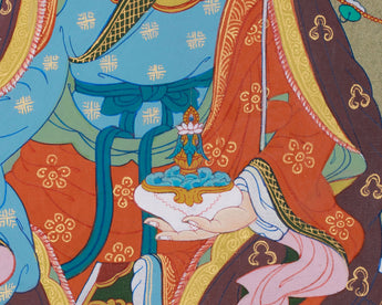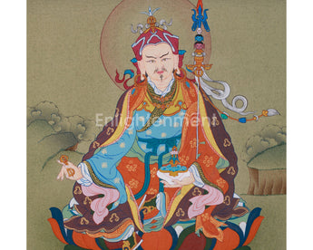 Guru Rinpoche, also known as Padmasambhava, is warmly honored as the teacher who introduced Buddhism to Tibet and is affectionately referred to as the “Second Buddha.” In this beautiful painting, he is peacefully seated on a lotus throne, wearing the traditional lotus hat and gently holding a vajra and skull cup—symbols of his strong wisdom and enlightened power. His calm yet powerful expression beautifully blends compassion and strength, inspiring practitioners and offering protection against obstacles. With its rich symbolism and skilled workmanship, this thangka painting is more than just art; it feels like a sacred presence, radiating blessings and guiding your spiritual journey.