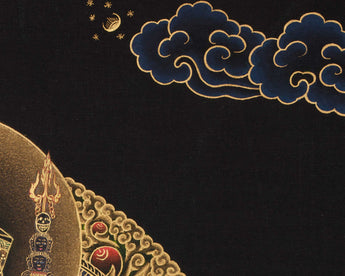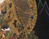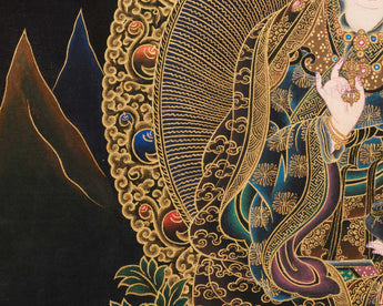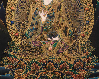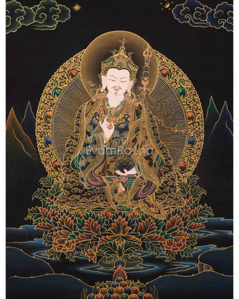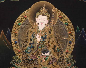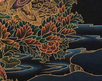 This Peaceful Guru Rinpoche Thangka radiates divine tranquility and sacred brilliance. Hand-painted by a skilled Nepali artist on fine cotton canvas, it uses acrylic colors and 24K gold. The Nakthang, or “gold-on-black,” style amplifies Guru Rinpoche's sacred presence, with golden lines shimmering like celestial light against a deep black background. Each brushstroke is applied with meditative care, blending traditional Tibetan art with deep devotion. This piece stands as a timeless symbol of enlightenment and peace.
