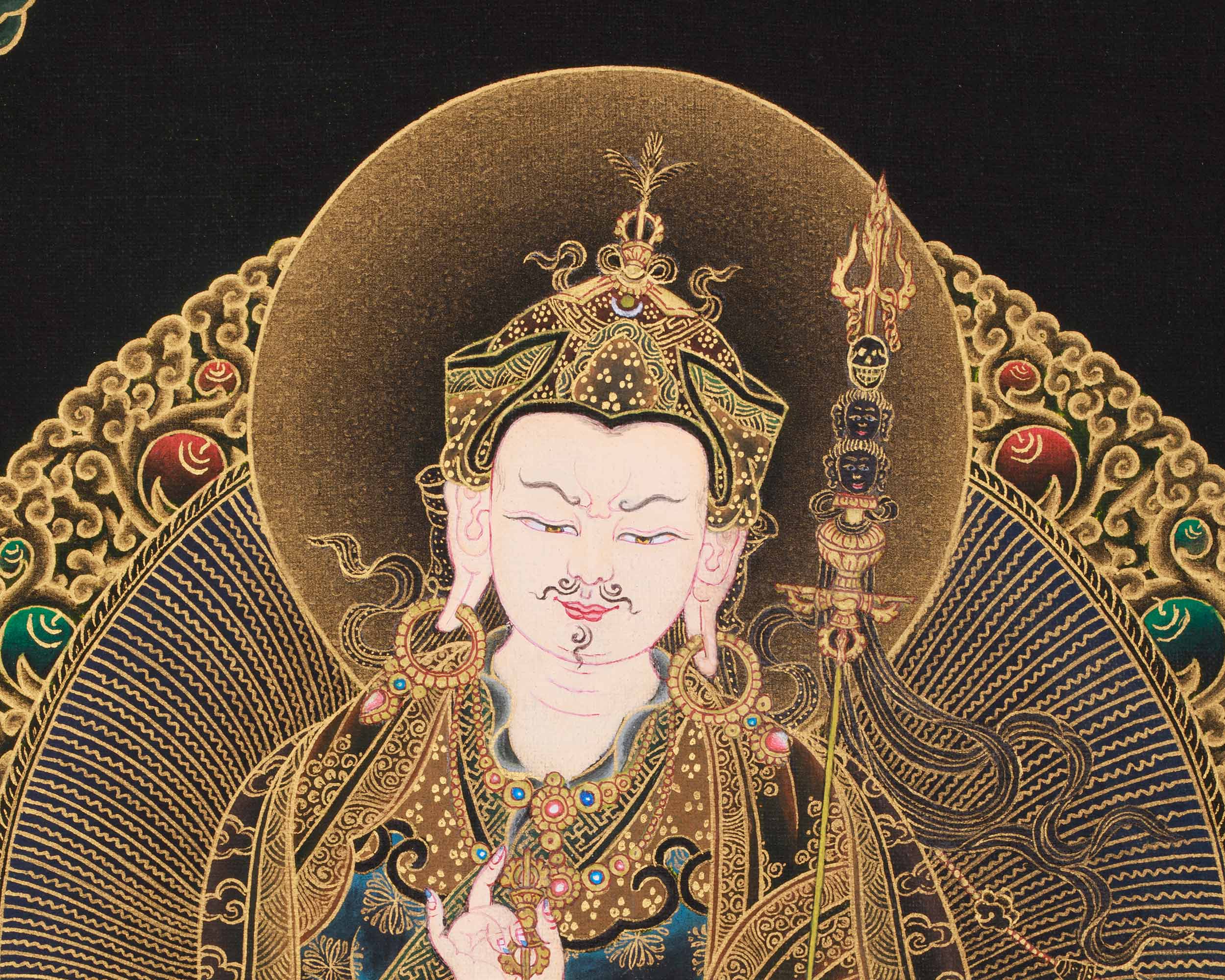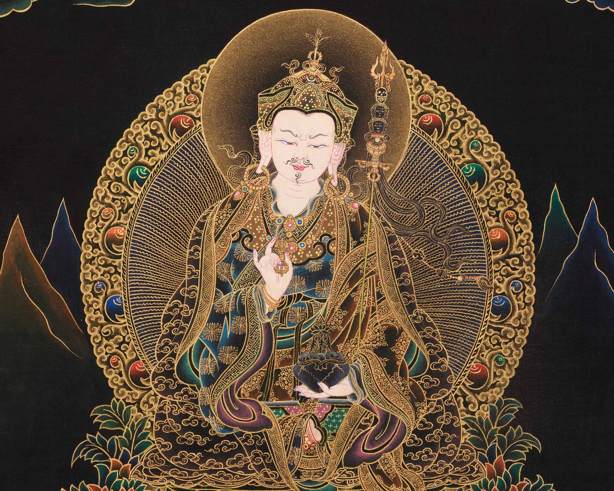 Peaceful Guru Rinpoche Thangka | Hand-Painted Tibetan Art of Wisdom & Protection | Gold on Black