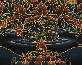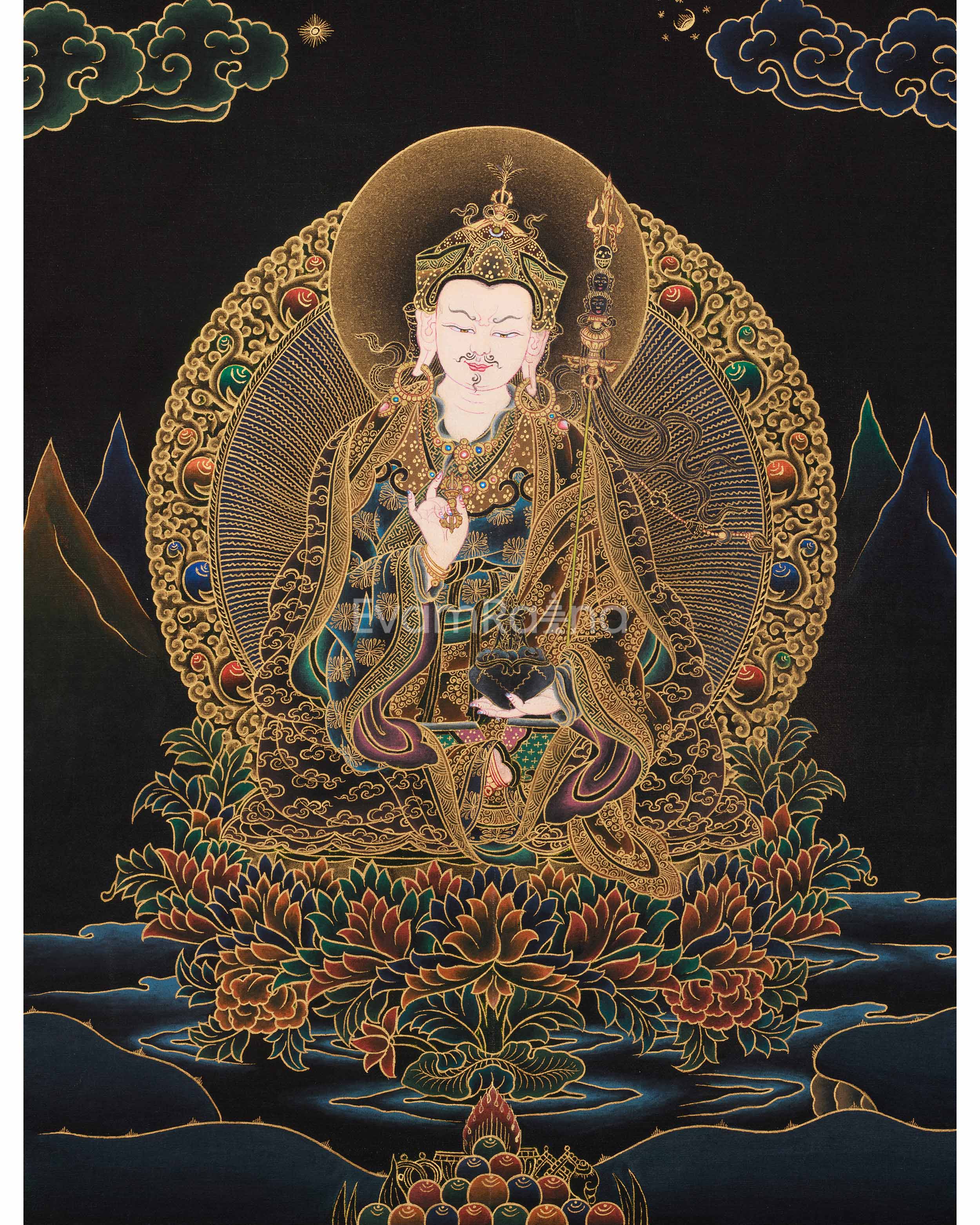 Every element in this Peaceful Guru Rinpoche Thangka symbolizes devotion, protection, and awakening. The contrast of gold and black depicts wisdom illuminating ignorance. Invite this hand-painted piece into your home to receive Guru Rinpoche’s blessings of peace, guidance, and spiritual growth.