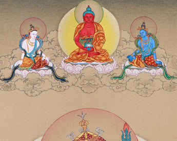 Guru Rinpoche, also known as Padmasambhava, is esteemed as the “Second Buddha” for his pivotal role in introducing Vajrayana Buddhism to Tibet during the 8th century. In this thangka, he is depicted seated majestically upon a lotus throne, radiating boundless compassion and enlightened power. His two principal consorts—Mandarava and Yeshe Tsogyal—are positioned around him, symbolizing wisdom and skillful means, which harmonize with his enlightened activity. Above him, the presence of Amitabha Buddha, flanked by Chenrezig and Vajrapani, signifies the transmission of blessings, compassion, and protective power supporting his enlightened mission.