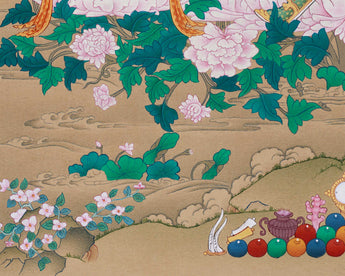 The skillful application of Lhasa stone colors imparts a luminous vibrancy to each figure. At the same time, the 24K gold accents highlight the sacred qualities, such as the lotus flowers and glowing halos. This thangka is a spiritual gateway, symbolizing Guru Rinpoche’s commitment to guiding practitioners, clearing obstacles, and leading beings to enlightenment.