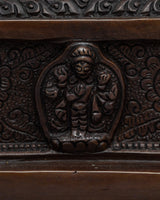 Our Tibetan Buddhist Stupa, a magnificent work of art that stands 28 cm tall and weighs 2.62 kg, will elevate your spiritual haven. This stupa, made of oxidized copper, exudes a sense of tranquility and wisdom from the past.