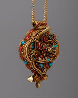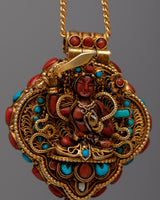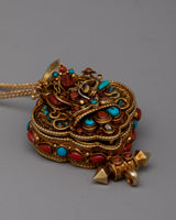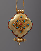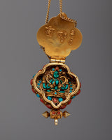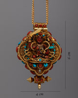The Ghau, which is embedded with turquoise and coral stones, has a deep symbolic meaning in Tibetan Buddhism. The locket is given a sense of security and spiritual vigor by these stones, which are well known for their healing qualities. A further level of spiritual depth and direction is provided by the presence of Manjushri, the Bodhisattva of Wisdom, who was sculpted outer side of Ghau.