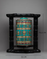 This prayer wheel, which stands 64.5 cm tall, draws attention and acts as a center of focus for devotion and reflection. It is said that while it spins, mantras and prayers are released into the cosmos, bringing blessings and good vibes. It is believed that the sound of the wheel moving will cleanse bad energy and effect spiritual transformation. The Prayer Wheel encourages practitioners to go on a journey of introspection and spiritual awakening with its auspicious design and sacred purpose.