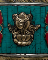 The Auspicious Decor Prayer Wheel is an eye-catching addition to any holy area because it blends traditional workmanship with spiritual symbolism. Crafted by hand from copper and featuring a wooden frame, it emanates a sense of genuineness and respect. The prayer wheel, which is adorned with elaborate inlays of coral and turquoise stones, is not only aesthetically pleasing but also has profound spiritual meaning. It represents enlightenment, purity, and protection.
