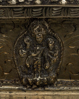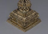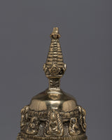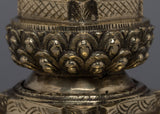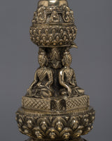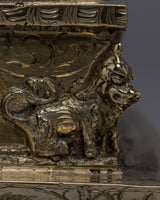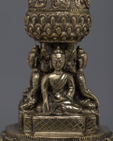 The stupa is a grand and magnificent Buddhist architectural structure made of Brass. It is adorned with lion sculptures at its four corners, contributing to its magnificent appearance. The main attraction of the stupa is the depiction of Buddha figures seated on a lotus pedestal, symbolizing peace and enlightenment. The intricate design and the use of valuable materials make this stupa a beautiful expression of spiritual devotion.