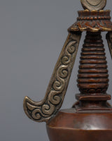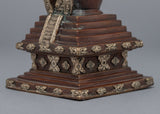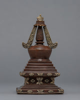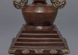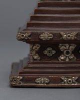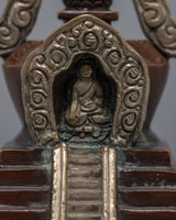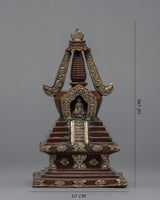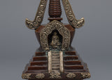 This beautifully crafted stupa is a handmade masterpiece created with exquisite attention to detail by skilled artisans. Made with a Silver plated finish, it features an intricately designed statue that is crafted onto the bumpa. The stupa symbolizes enlightenment and peace, and its elegant design and silver finish make it an excellent addition to any home or meditation space. The statue on the bhumpa adds an extra layer of spiritual significance to this already remarkable piece. This stupa is a perfect way to bring a sense of calm and tranquility to any environment.