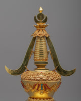 This magnificent Buddhist Chorten is a real work of art, meticulously carved on a Copper body. The stupa is embellished with beautifully placed gemstones, which provide a sense of elegance and brilliance to the design. The entire chorten is plated in 24k gold, giving it a sense of purity and luxury. The rich intricacies and architectural beauty of this religious monument are highlighted by the chorten-style craftsmanship. This Buddhist Chorten serves as a treasured reminder of devotion and reverence as a symbol of spiritual enlightenment and a place of prayer. Its presence adds a sense of calm and serenity to any environment, making it a treasured addition to any Buddhist collection or spiritual setting.