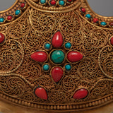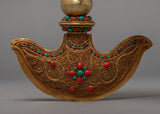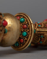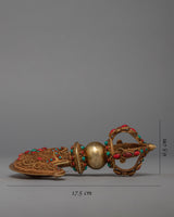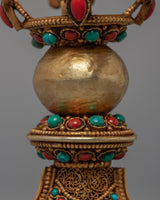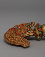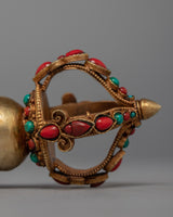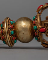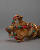 The Buddhist Drigug Knife is a Handcrafted copper body with 24K Gold plated, embedded with turquoise coral. Kartika is a ceremonial Buddhist ritual weapon that resembles a half-moon knife or chopper and is topped with a Vajra that serves as a handle for the knife. The Vajra-topped curved knife, also known as the flaying knife, is also referred to as the 'knife of the dakinis.'
