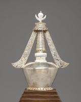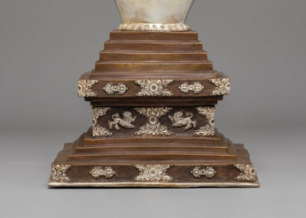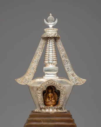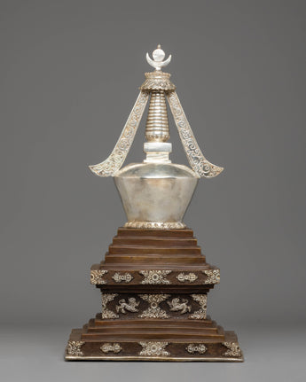 This Buddhist Enlightenment Symbol Stupa is a masterfully crafted shrine piece that embodies the essence of awakening, purity, and spiritual ascension. Made from a copper body with refined silver and gold plating, it carries the traditional architectural features of a Tibetan stupa, symbolizing the Buddha's enlightened mind. The smooth dome, rising spire, and protective finial express the journey toward higher realization and the harmony between wisdom and compassion.