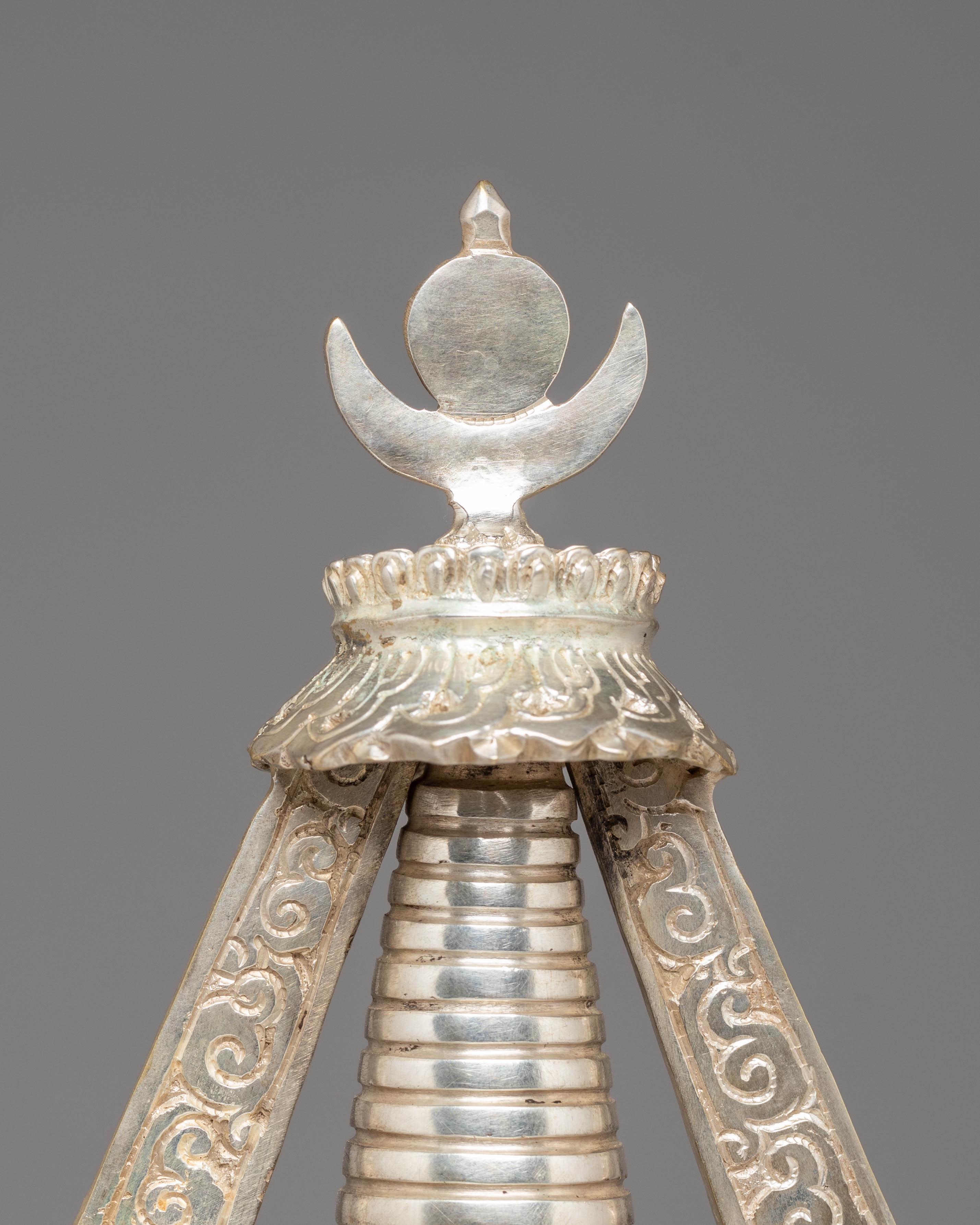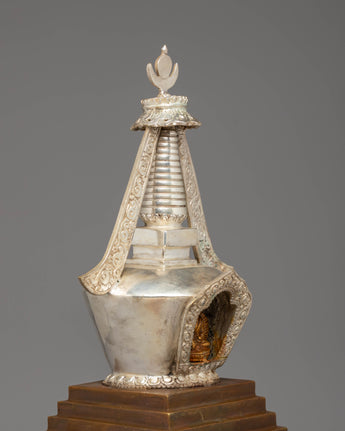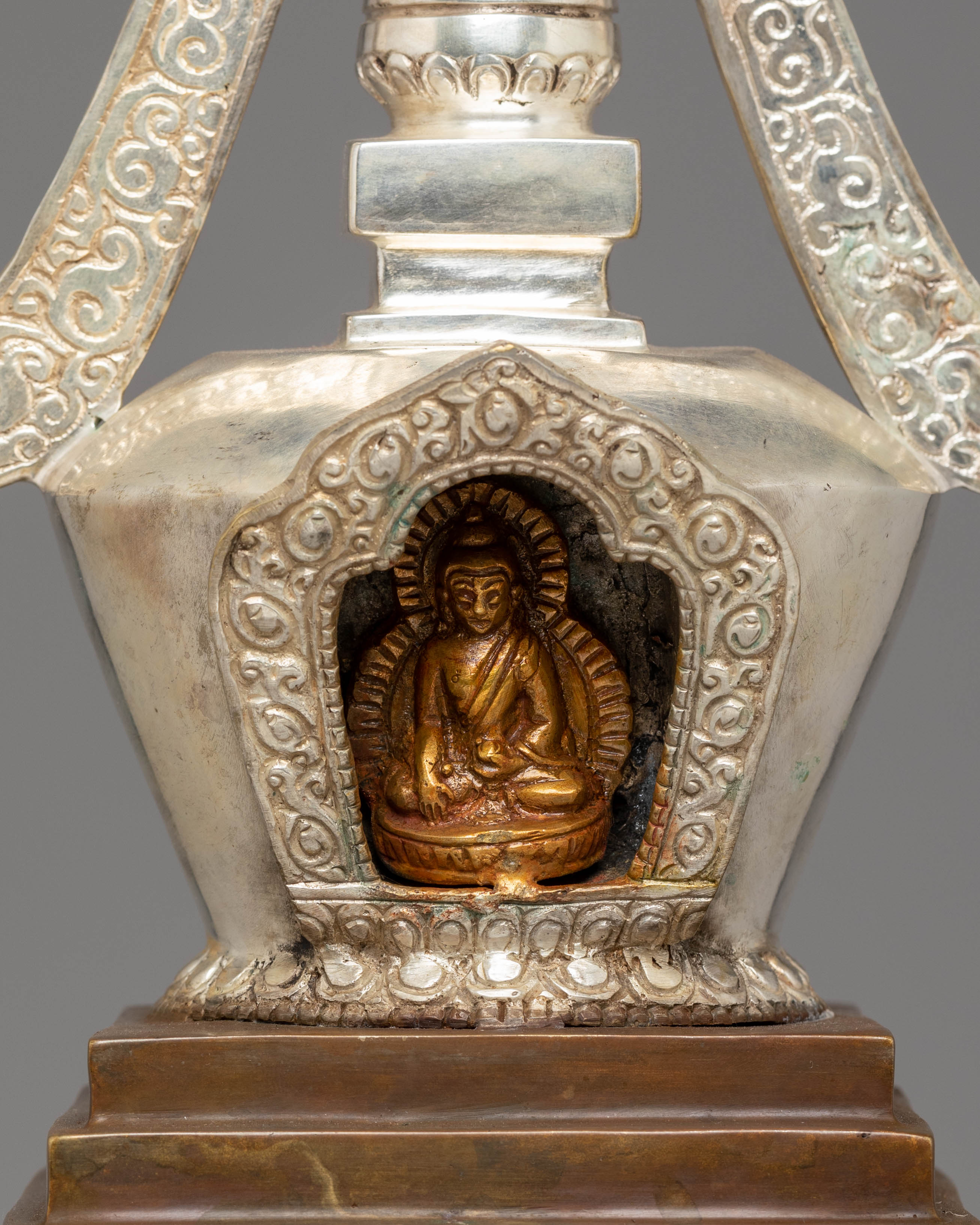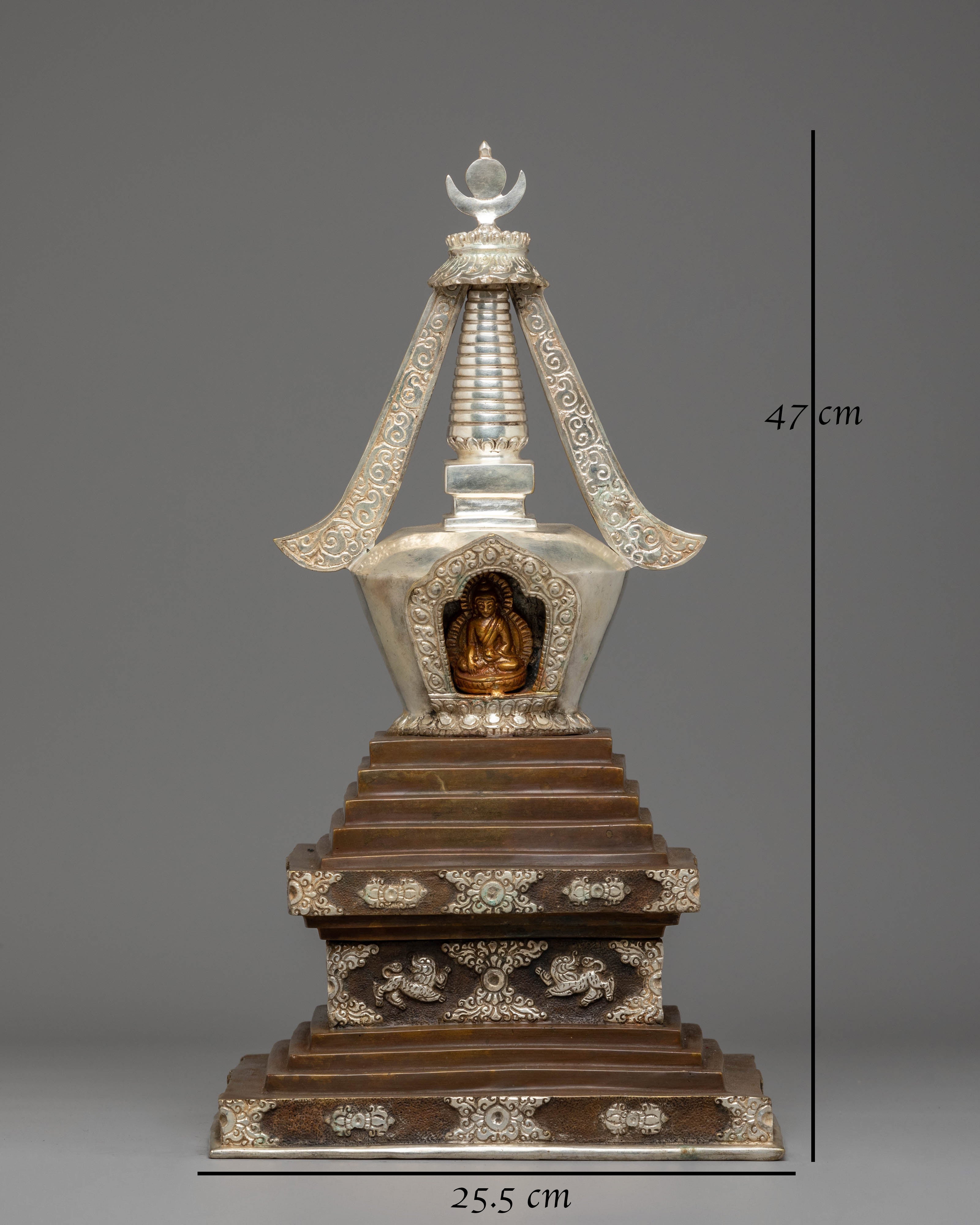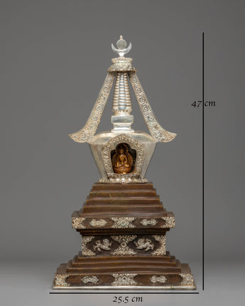 At the heart of the stupa lies a beautifully rendered gold-plated image of Shakyamuni Buddha, housed within an ornate niche. This sacred figure represents serenity, protection, and the ever-present guidance of awakened awareness. Intricate patterns, floral motifs, and layered platforms enhance the structure, while the soft acrylic color accents add depth and gentle contrast to the silver sheen. Every detail reflects devotion, artistry, and the heritage of Himalayan ritual craftsmanship.