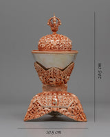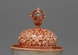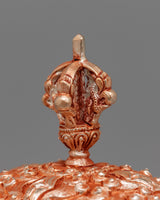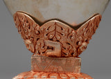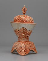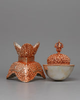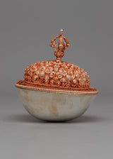 Our Buddhist Kapala Skull is a profound symbol of the spiritual path, delicately carved on a copper body and embellished with beautiful silver plating. Standing 20.5cm tall, this statue represents the essence of impermanence and the cycle of life and death in Buddhist philosophy. The skull's complex intricacies, together with the gleaming gold accents, offer a captivating visual expression of the transformational power of spiritual practice.