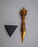 A phurba is a 3 edged Buddhist ritual item made from metal or wood. It have generally 3 faces at the top and crowned with the half vajra. The triple-bladed ritual dagger essentially symbolizes the powerful Buddha activity of the wrathful deity Vajrakilaya