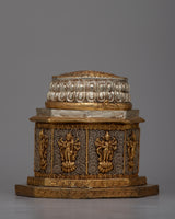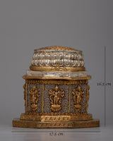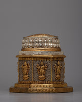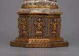 This beautiful statue invites followers to reflect on the Buddha's everlasting teachings by radiating a sense of spiritual elegance and profound insight. The statue's fine details are given more depth and dimension by the combination of gold and silver plating, which also heightens the statue's aesthetic appeal and symbolic meaning. The Copper Dharma Dhatu Statue is a profound reminder of the inherent purity and limitless potential among all creatures, motivating practitioners to awaken to the true nature of life whether it is put in a shrine or meditation area.