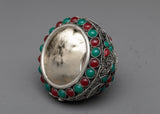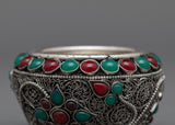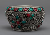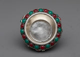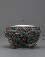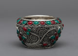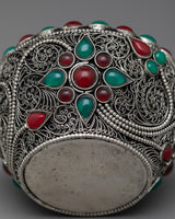 Step into the realm of sacred rituals with our exquisitely handcrafted Copper Golpa, an essential tool for devotional practices. Crafted with precision on a copper body and adorned with a silver plating, this Golpa radiates an aura of divine elegance. Its aura is further elevated by the delicate inlay of radiant rubies and vibrant emeralds, infusing it with their spiritual energy. As you immerse yourself in its enchanting sounds during your devotional practices, let the Golpa deepen your connection with the divine and create a space of tranquility and reverence. Embrace the spiritual journey with this magnificent piece, dedicated to enriching your sacred experiences.