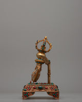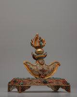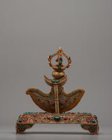 The Kartika Knife becomes a harmonic blend of earthly components and divine symbols when inlaid with original and artificial stones like coral, turquoise, and lapis lazuli. The spiritual characteristics of these stones add to the knife's ceremonial importance, bestowing it protection, knowledge, and compassion. The Copper Kartika Knife is a highly esteemed tool in Buddhist ceremonies and rituals. It is a potent symbol that may cut through ignorance and illusion and direct practitioners on the path to enlightenment.