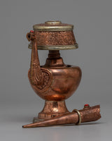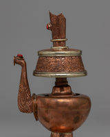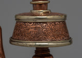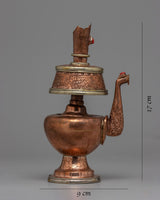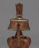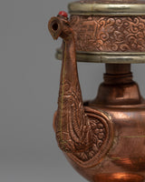 Experience the sacred charm of our painstakingly crafted Bhumpa Copper Vase, which is made by hand with great care and attention to detail. This 17-cm-tall vase, made from a mixture of copper and brass, embodies the ageless practices of Tibetan spirituality.