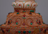 Introducing the Crystal Buddhist Stupa, a divine representation of spiritual enlightenment and inner peace. Handcrafted with the utmost care, this stupa is adorned with luxurious 24k gold electroplating and silver plating, giving it a timeless aura of elegance and divinity. Its intricate design incorporates artificial stones such as Turquoise, ruby, and Panna, which add vibrancy and spiritual energy.