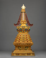 The Stupa Statue is a revered symbol in Buddhism, representing the teachings of the Buddha, the journey toward enlightenment, and the purity of spiritual practice. The gold-plated copper finish symbolizes the radiance of wisdom, while the gemstones reflect the brilliance of inner light and awakening. This statue serves as an essential reminder of the steps one must take on the path to enlightenment and inner peace. Whether placed in a meditation room, temple, or home, this stupa will bring profound serenity and inspiration to its surroundings, making it the perfect addition to any space dedicated to mindfulness.