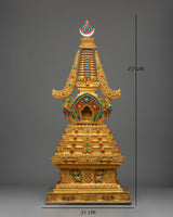 This beautifully crafted Decorative Tibetan Stupa stands 67cm tall and 31cm wide, weighing 7.57kg. It serves as a powerful symbol of enlightenment, peace, and spiritual protection. Made from copper and electro-gold plated, it features vibrant acrylic colors and meticulously placed gemstones, creating a stunning visual display that enhances any sacred space. Designed for home altars, meditation rooms, or temple settings, this stupa radiates positive energy and spiritual blessings.