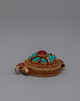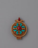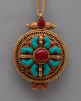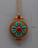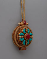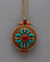 Experience our prayer locket's great beauty and tremendous spiritual depth, the Double Vajra Ghau Box. This gorgeous locket is handcrafted on a solid copper body and plated in electro gold and electro silver, giving it a dazzling gloss that accentuates its delicate pattern. Artificial coral and turquoise stones, which are expertly inlaid to produce a harmonic and visually beautiful piece, add vivid splashes of color.