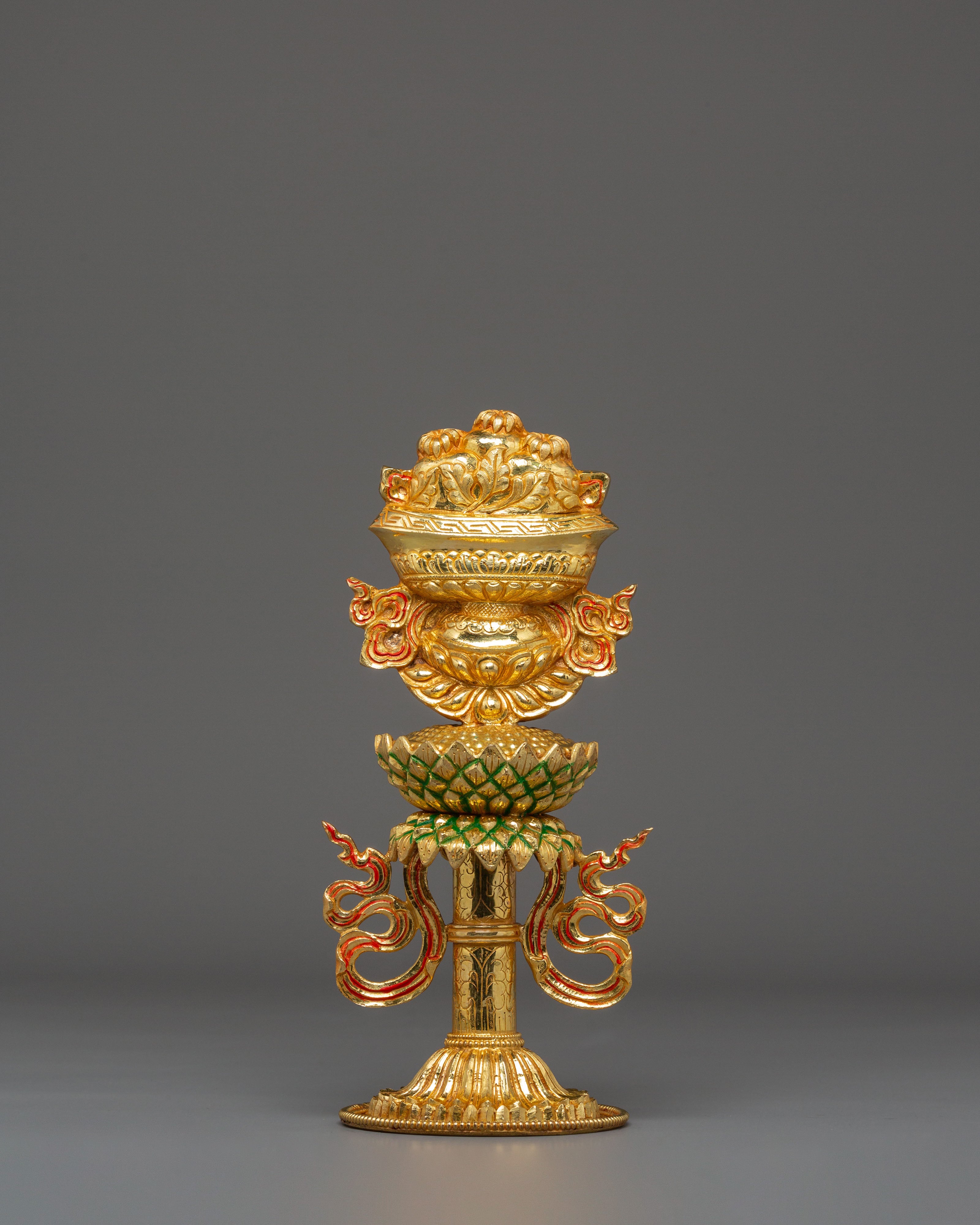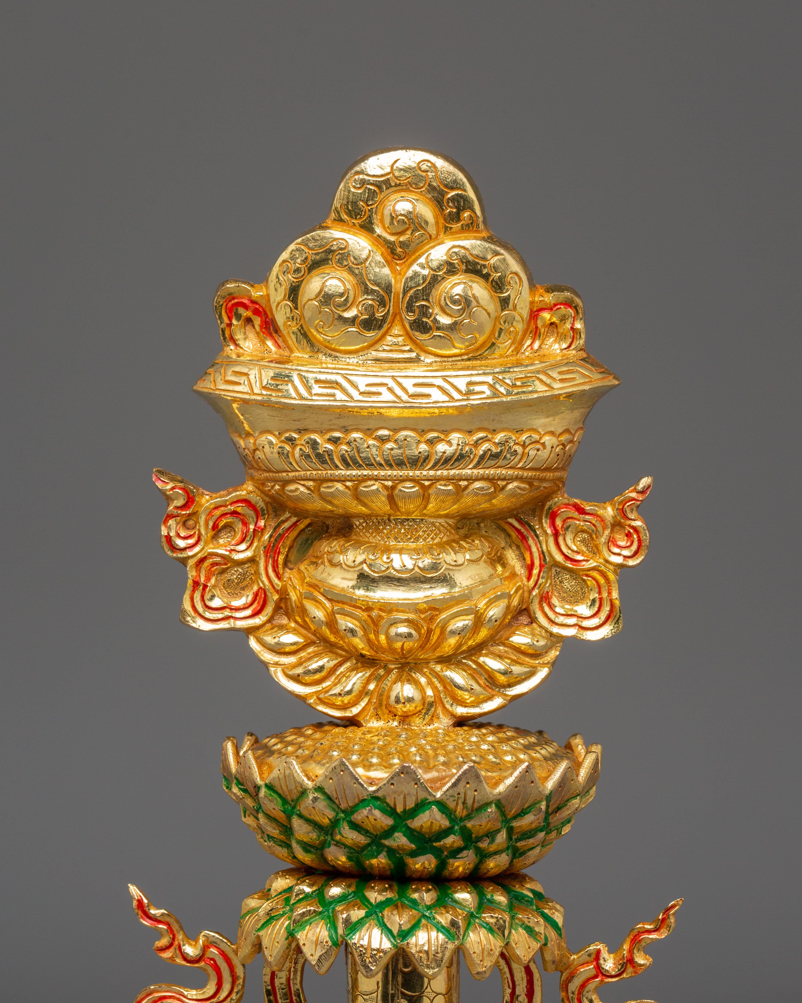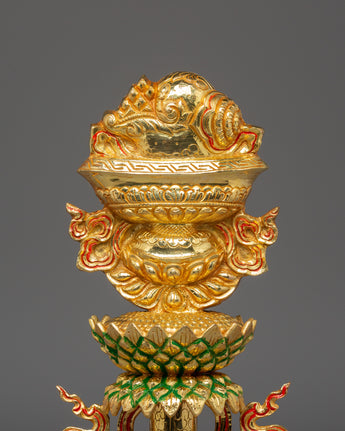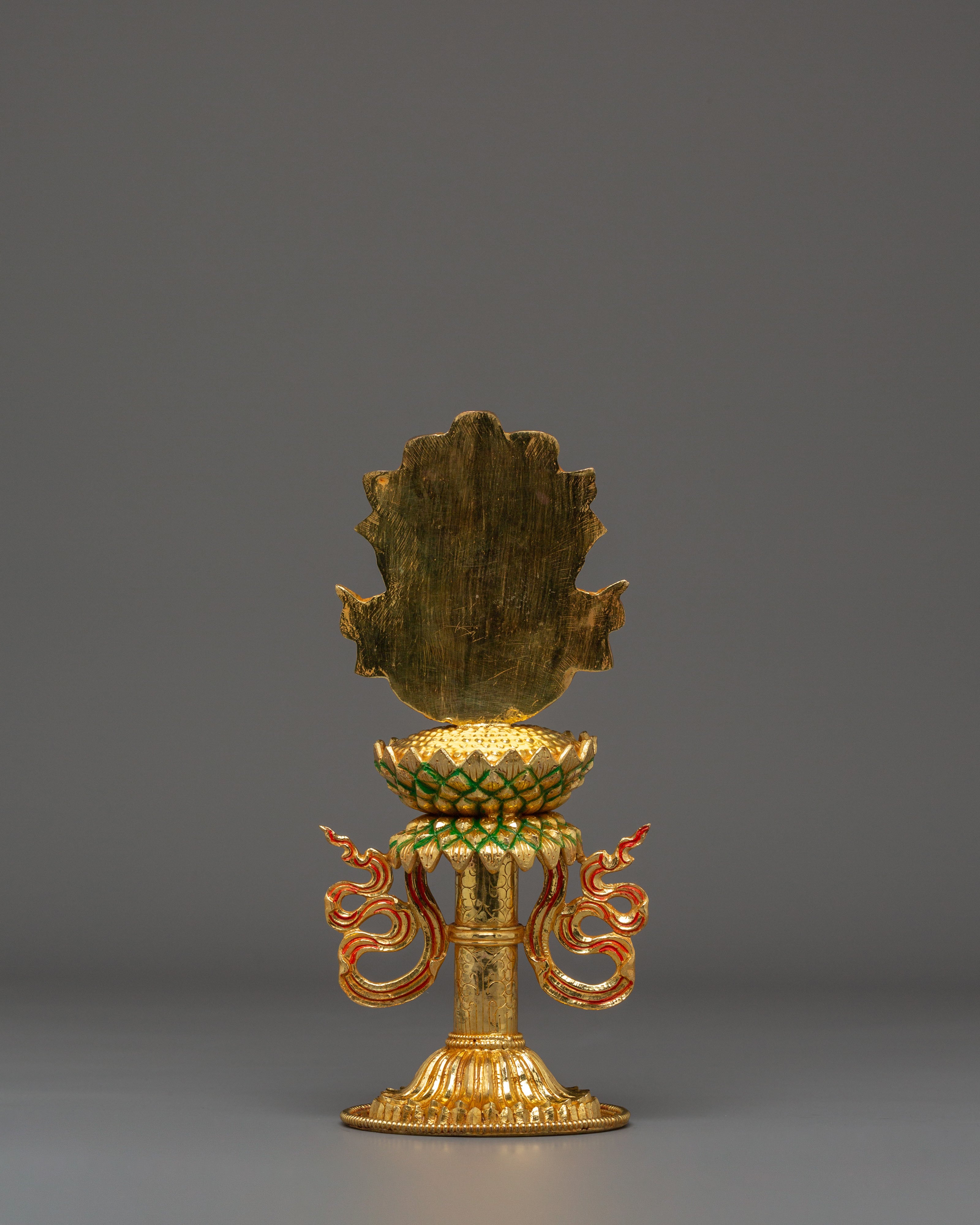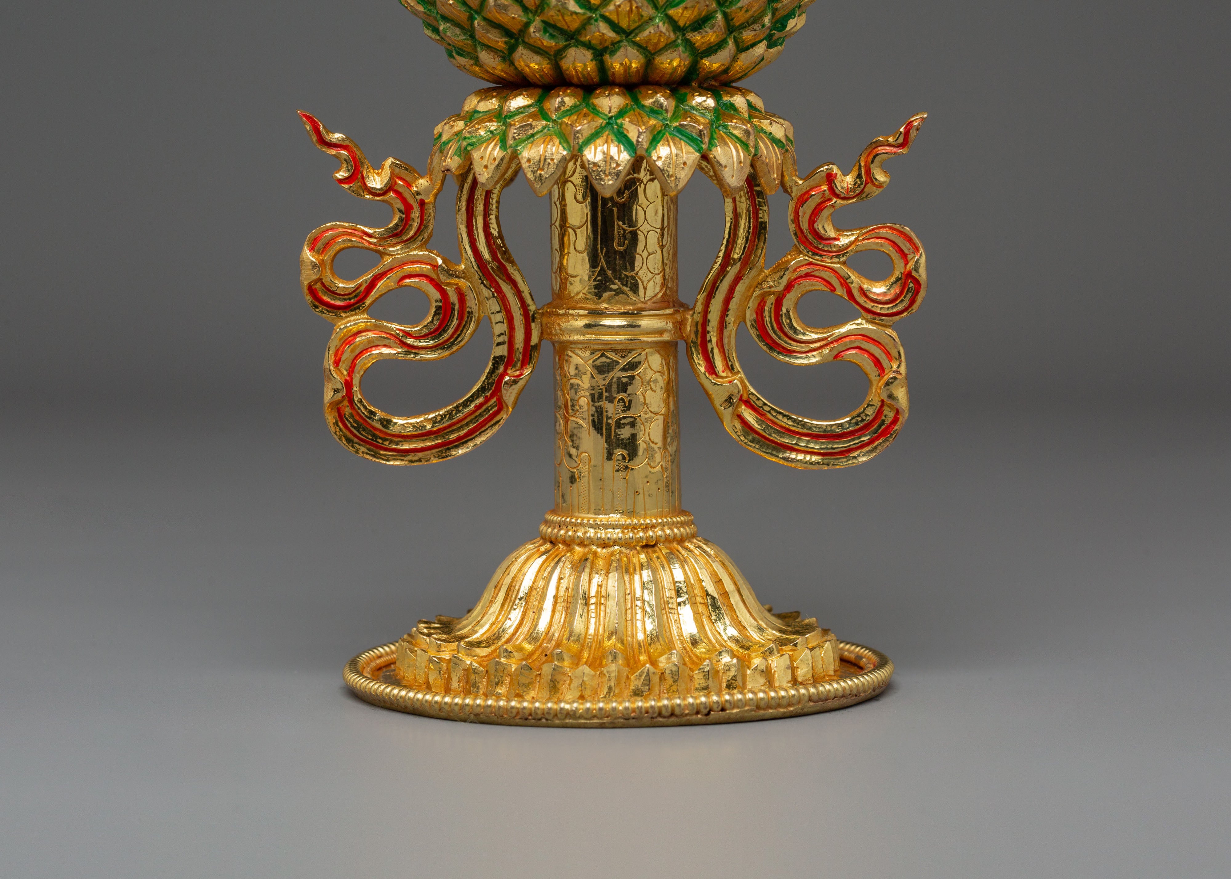 The exquisite design and embellishments of the eight emblems add to their spiritual significance, with each element signifying a particular blessing and virtue. The Lotus Flower symbolizes purity and enlightenment, whilst the Treasure Vase represents prosperity and abundance. The Wheel of Dharma depicts the Buddha's teachings, while the Victory Banner signifies the triumph of Dharma. These symbols are displayed on exquisite copper pedestals artistically embellished with gold-plated details and brilliant acrylic coloring, making them suitable for both altar decoration and ritual offerings.