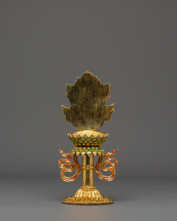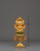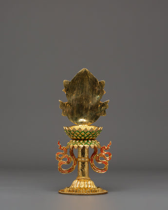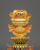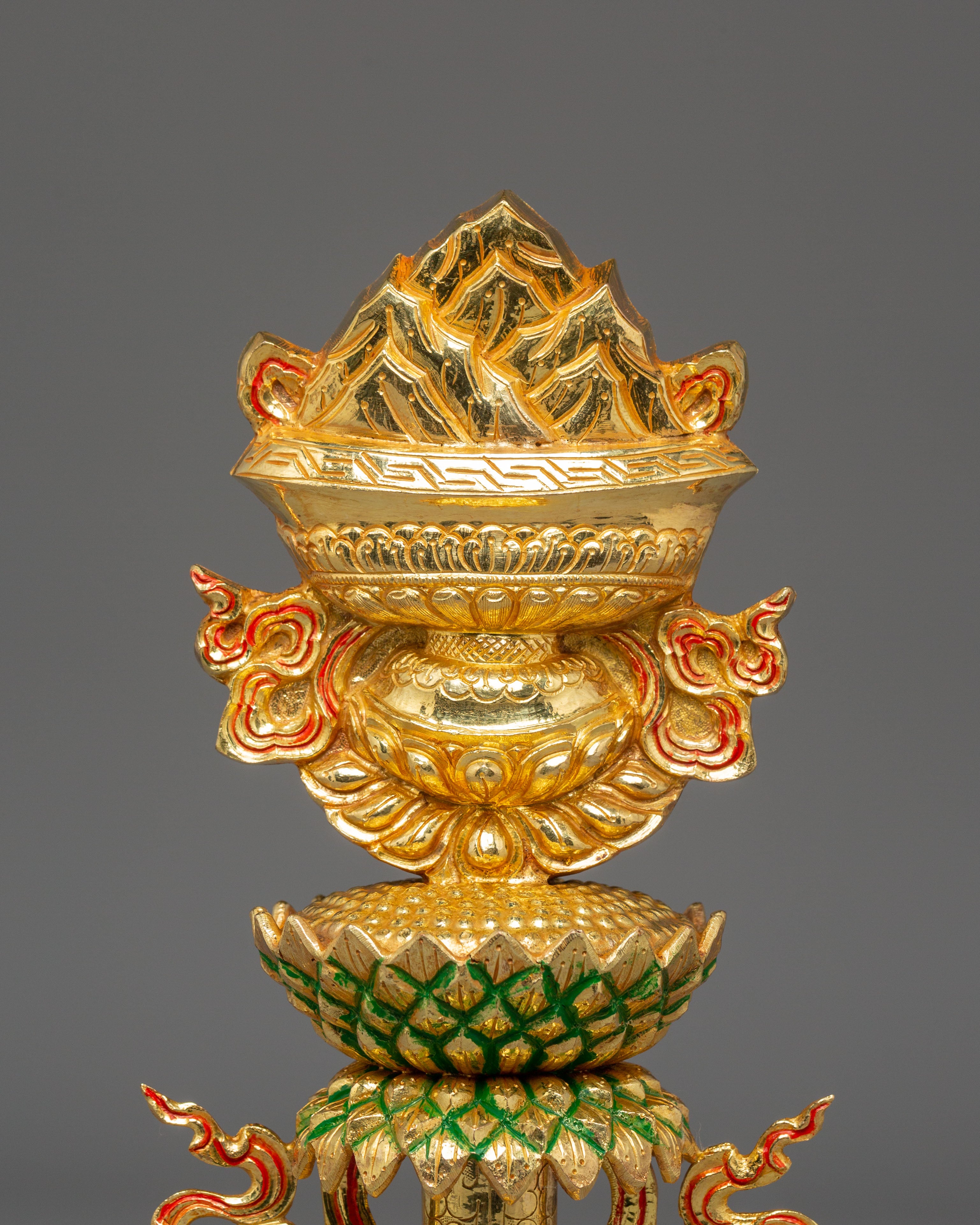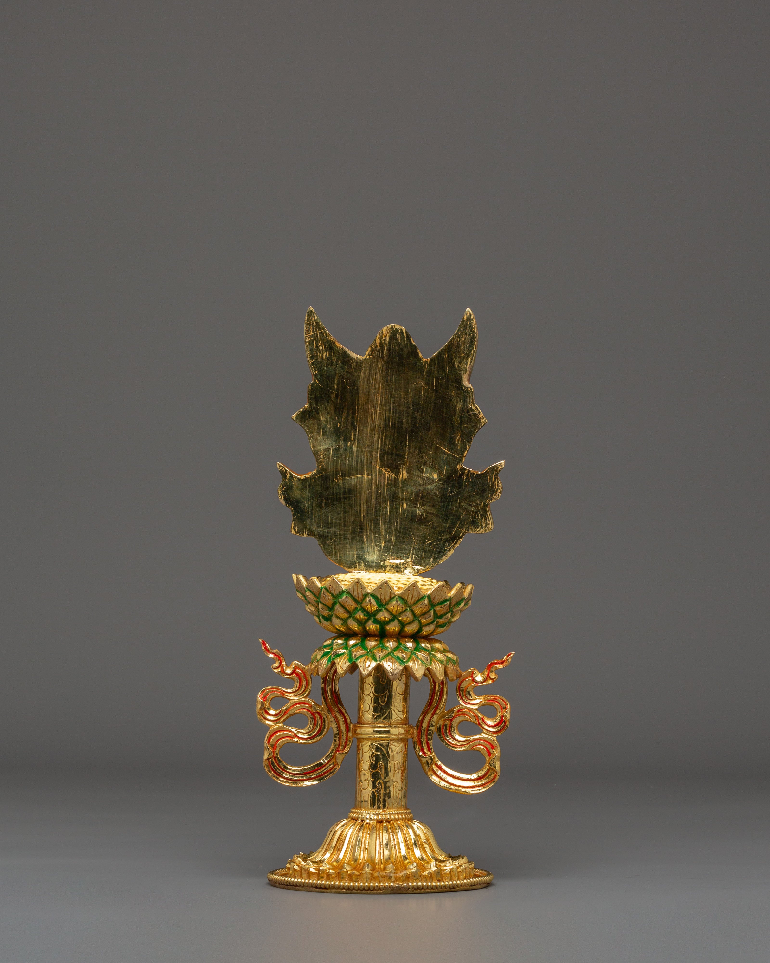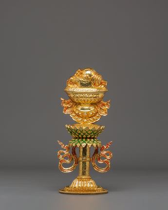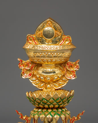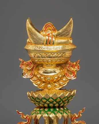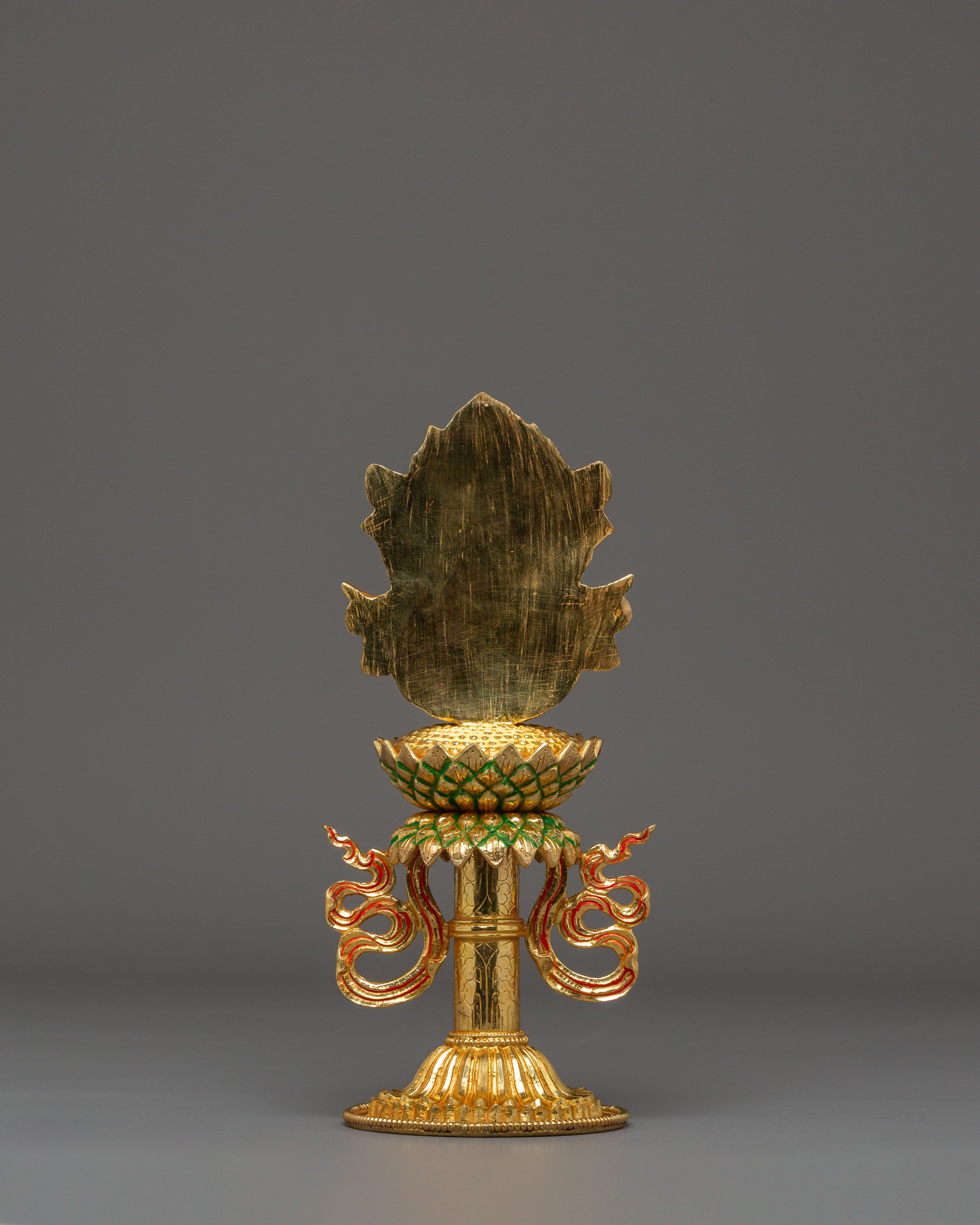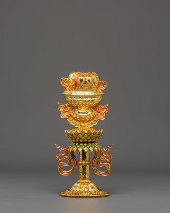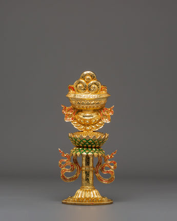 The exquisite design and embellishments of the eight emblems add to their spiritual significance, with each element signifying a particular blessing and virtue. The Lotus Flower symbolizes purity and enlightenment, whilst the Treasure Vase represents prosperity and abundance. The Wheel of Dharma depicts the Buddha's teachings, while the Victory Banner signifies the triumph of Dharma. These symbols are displayed on exquisite copper pedestals artistically embellished with gold-plated details and brilliant acrylic coloring, making them suitable for both altar decoration and ritual offerings.