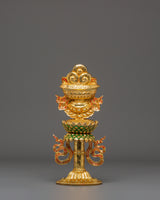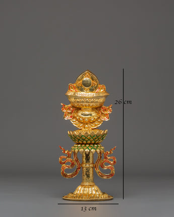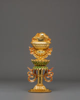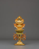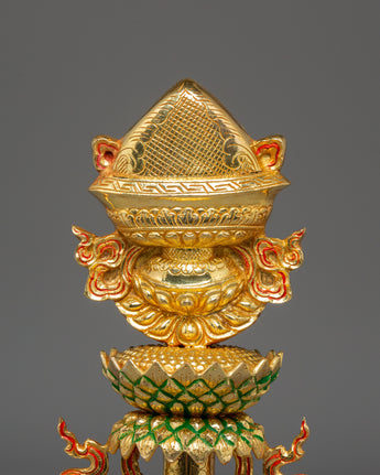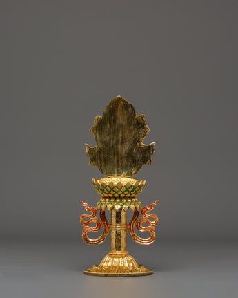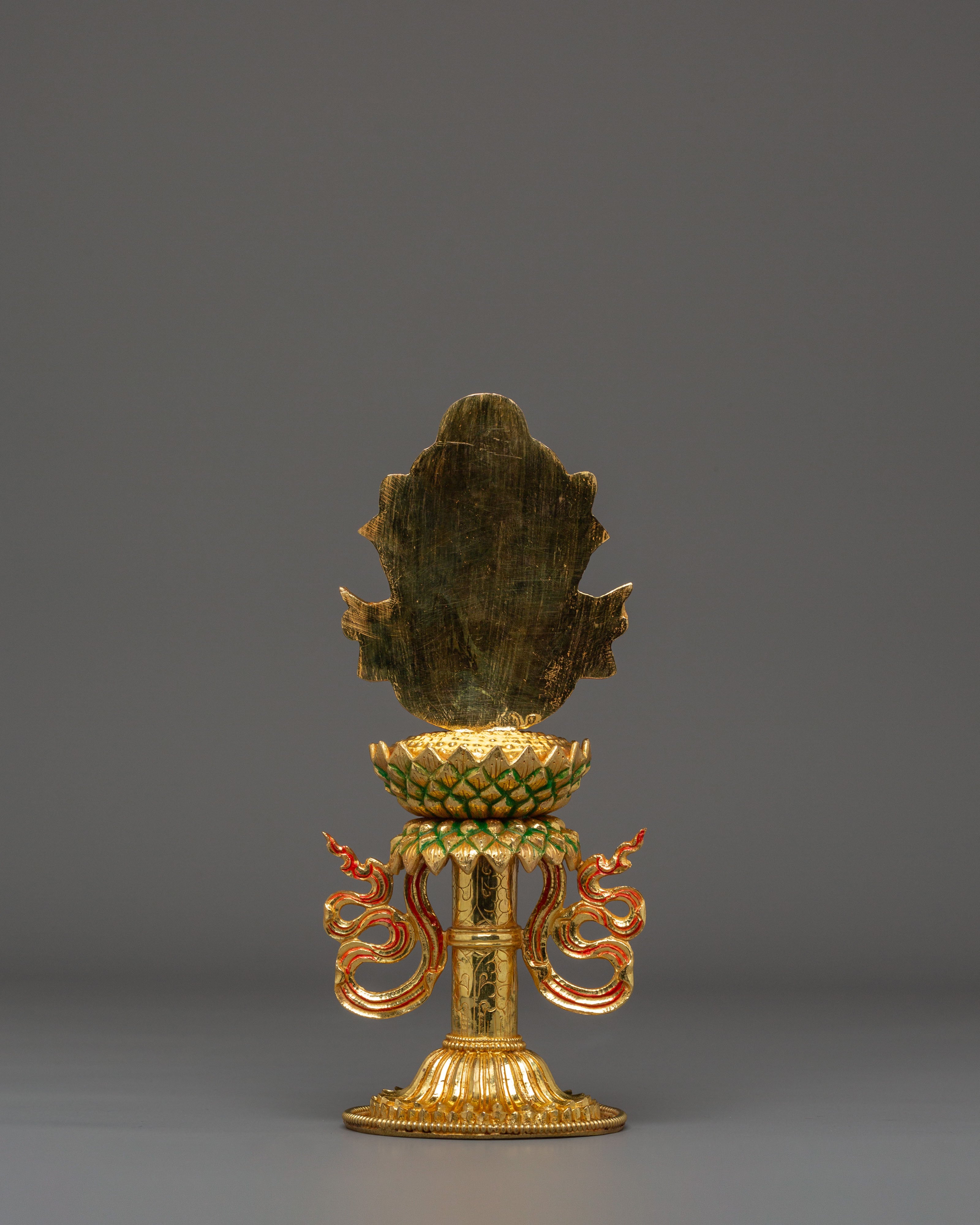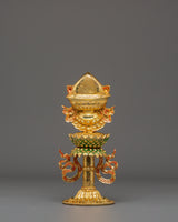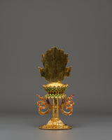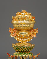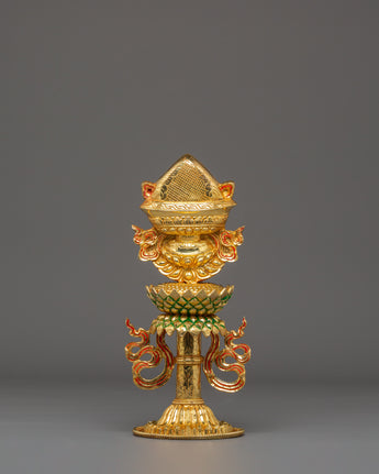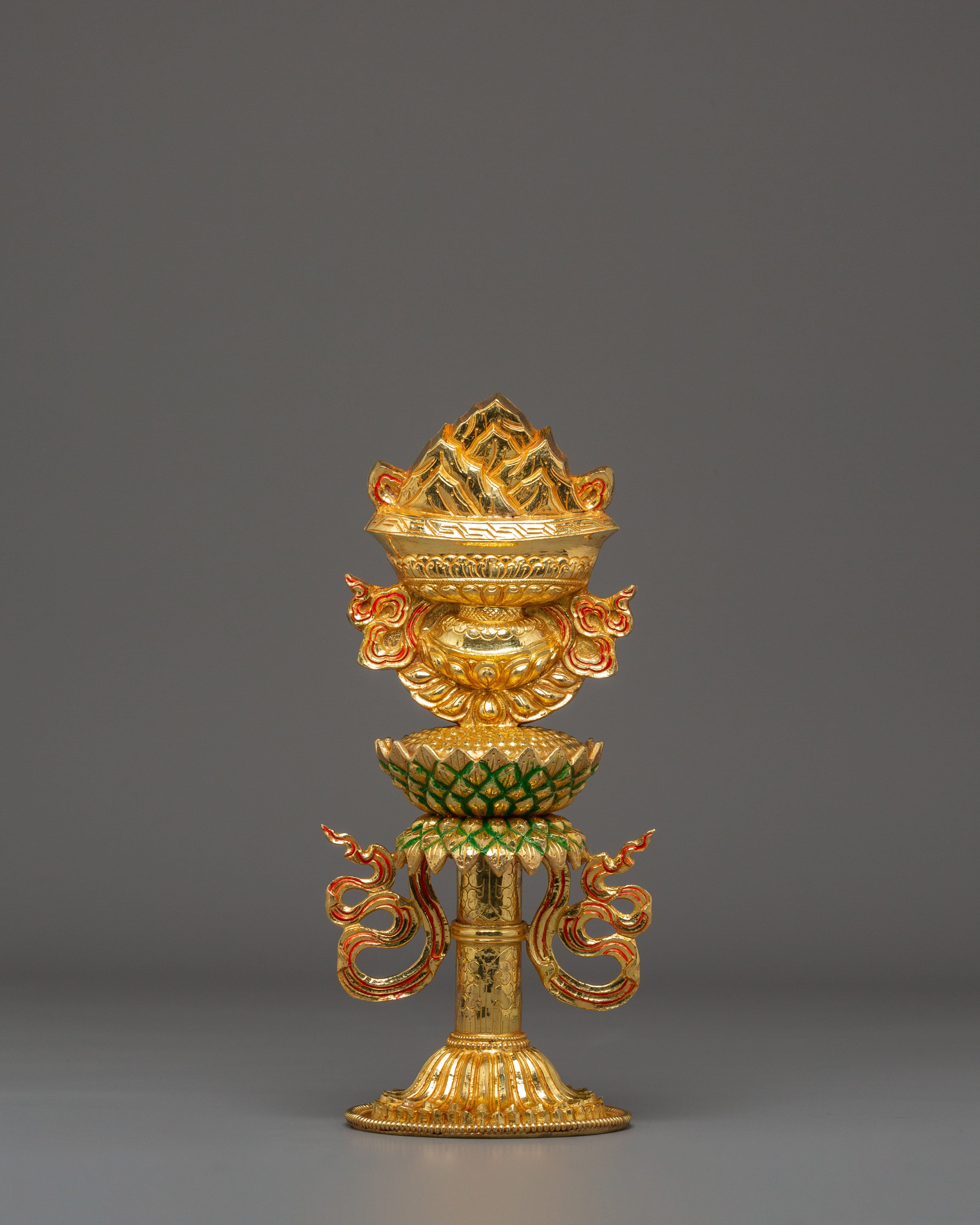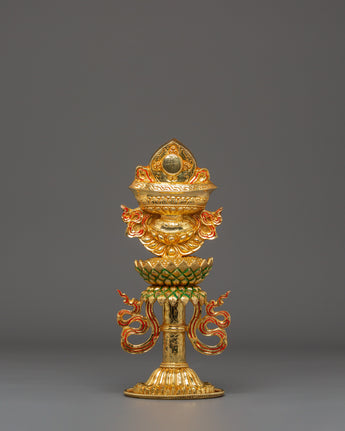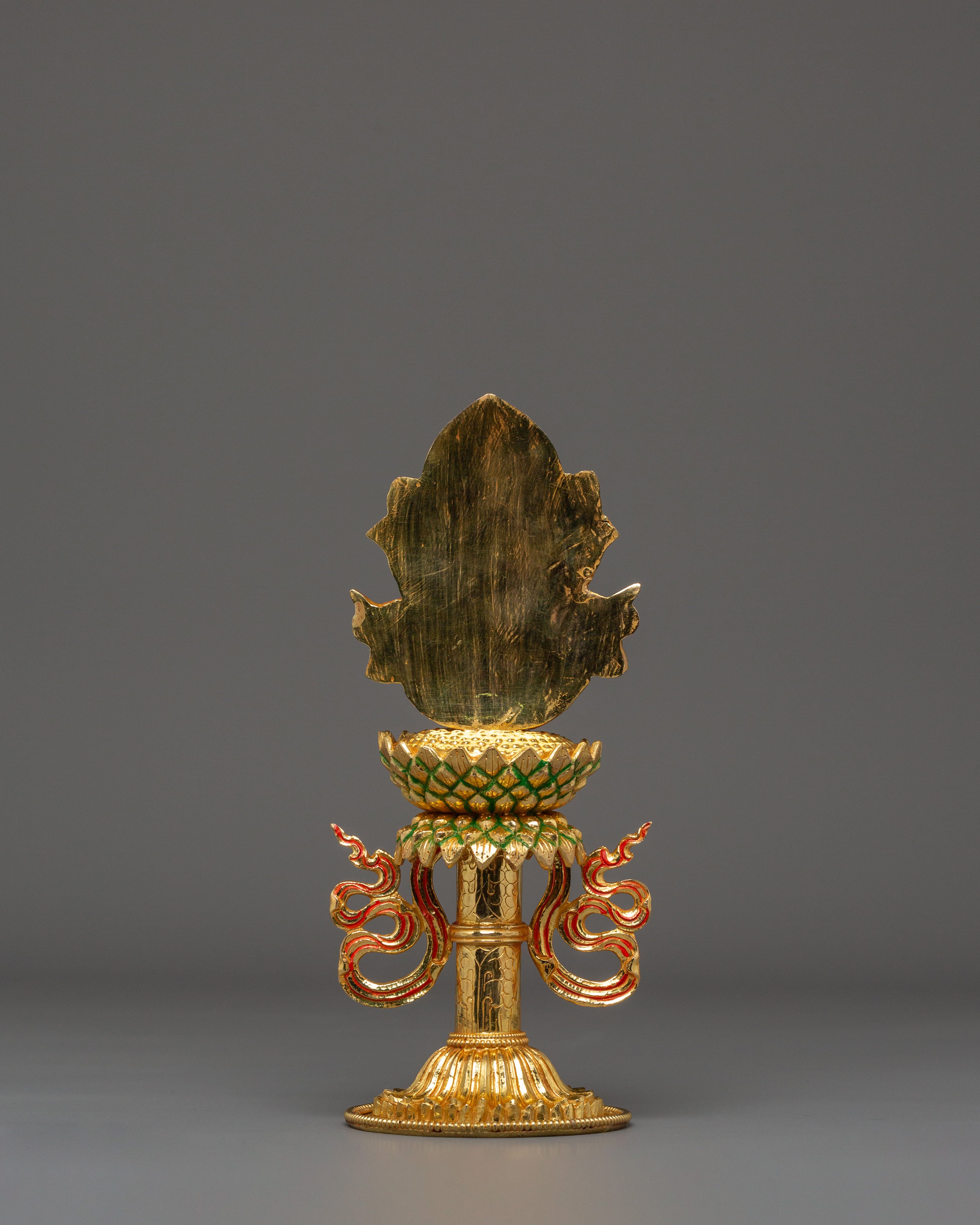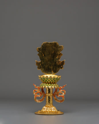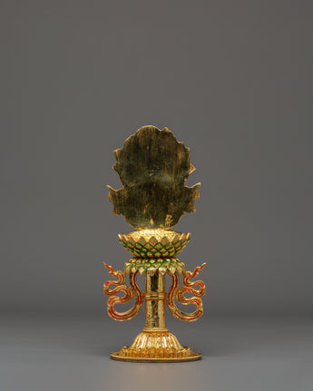 The exquisite design and embellishments of the eight emblems add to their spiritual significance, with each element signifying a particular blessing and virtue. The Lotus Flower symbolizes purity and enlightenment, whilst the Treasure Vase represents prosperity and abundance. The Wheel of Dharma depicts the Buddha's teachings, while the Victory Banner signifies the triumph of Dharma. These symbols are displayed on exquisite copper pedestals artistically embellished with gold-plated details and brilliant acrylic coloring, making them suitable for both altar decoration and ritual offerings.