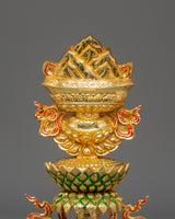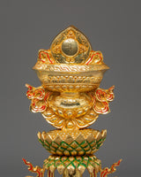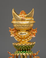 The Eight Auspicious Symbols for Decor set features a vivid, solemn selection of Buddhist images ideal for any spiritual area. These symbols are said to provide prosperity, protection, and spiritual blessings. Each sculpture is handcrafted from gold-plated copper with delicate acrylic color detailing, measuring 26cm tall and 13cm wide, and represents the ageless wisdom of Tibetan Buddhism. The set depicts sacred symbols such as the Lotus Flower, the Eternal Knot, the Conch Shell, the Golden Fish, the Wheel of Dharma, the Victory Banner, the Treasure Vase, and the Parasol.