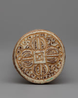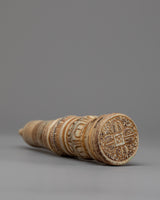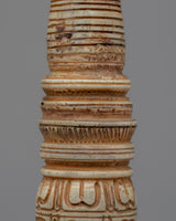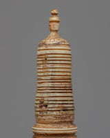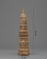 This one-of-a-kind Stupa is lovingly handcrafted from ethically sourced bone, demonstrating a dedication to sustainability and craftsmanship. The Stupa has complex carvings and decorations, including the renowned Vishwa Vajra symbol, which is masterfully carved on its base. The bone material gives the Stupa a particular texture and look, creating a feeling of natural beauty and authenticity. In Buddhist traditions, this handcrafted Stupa serves as a sacred emblem, encouraging devotion and reverence. Its exquisite pattern and symbolic value make it a treasured piece for spiritual practice, meditation, or as a decorative accent in any area.