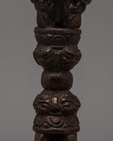 Crafted with meticulous attention to detail, the Five-Pronged Vajra radiates a strong presence and profound spiritual meaning. Crafted by hand on oxidized bronze, it carries the weight of long-standing tradition and archaic iconography. Each prong, which stands for conversion of the five negative emotions into positive attributes, symbolizes a distinct facet of enlightened understanding. This holy object is given an air of antiquity and reverence by its rusted bronze finish, which echoes the unchanging teachings of Tibetan Buddhism.