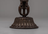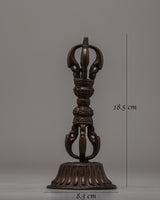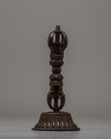The stand that comes with this Vajra improves its presentation and makes it easier to adore during rituals and meditation exercises. The Five-Pronged Vajra is a potent tool for opening the mind and strengthening one's connection to the divine, whether it is utilized as a focal point in ceremonial settings or as a reminder of spiritual lessons in daily life. It represents the combination of wisdom and compassion on the path to enlightenment and is highly prized in Tibetan Buddhism due to its elaborate design and symbolic meaning.