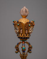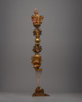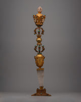 Introducing the exquisite combination of profound significance and masterful craftsmanship—the Gold-plated Copper Phurba. This ceremonial dagger, called a phurba, is handcrafted on a copper body and delicately electro-gold plated. It is embellished with crystal, turquoise, coral, and lapis lazuli. It is 1.45 kg in weight and has dimensions of 66 cm in height by 15 cm in breadth.