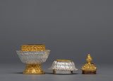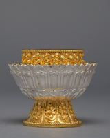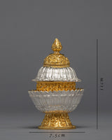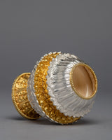 The Dhupur Golden Pot, a testament to exquisite craftsmanship, is meticulously handcrafted from copper, infusing it with a sense of sacred elegance. With a radiant aura emanating from its 24k gold and silver plated surface, this pot serves as a symbol of devotion and ritual significance. Standing at a height of 11cm, its compact size belies its spiritual impact, making it a perfect vessel for holding fragrant offerings and enhancing the ambiance of sacred spaces. Every curve and detail of this pot speaks of devotion, tradition, and artistry, inviting practitioners to engage in meaningful rituals and connect with a profound spiritual heritage.