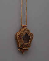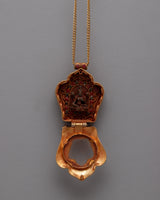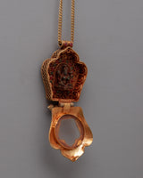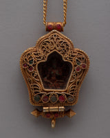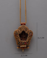 The Green Tara Tibetan Ghau Pendant is a beautiful piece of jewelry that is perfect for spiritual seekers, jewelry collectors, and devotees. It is a religious artifact with significant religious value. This pendant encourages introspection and respect, whether it is worn near the heart during meditation or prayer or shown as a treasured addition to a collection. With its artistic beauty and spiritual symbolism, it elevates any space and is a valued addition to any collection or personal altar. The pendant's overall visual appeal is enhanced by the electro-gold plating, which gives a touch of improvement and devotion. This pendant is more than just a pretty item; it's a significant relic that represents fine craftsmanship and profound spiritual principles.