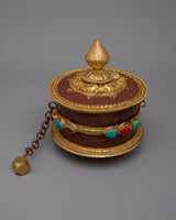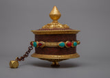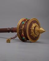 The Hand Prayer Wheel is a captivating blend of artistry and spirituality. Meticulously crafted with a copper body and adorned with resplendent 24k gold plating, it radiates opulence and deep symbolism.